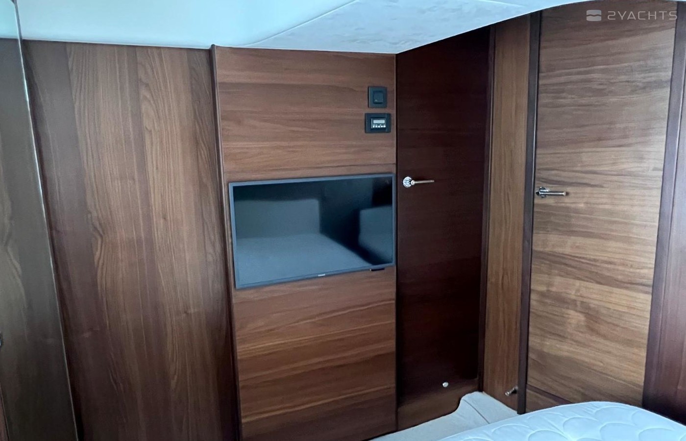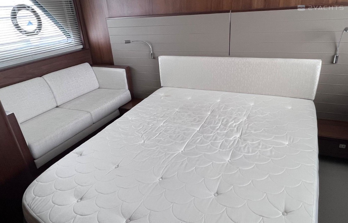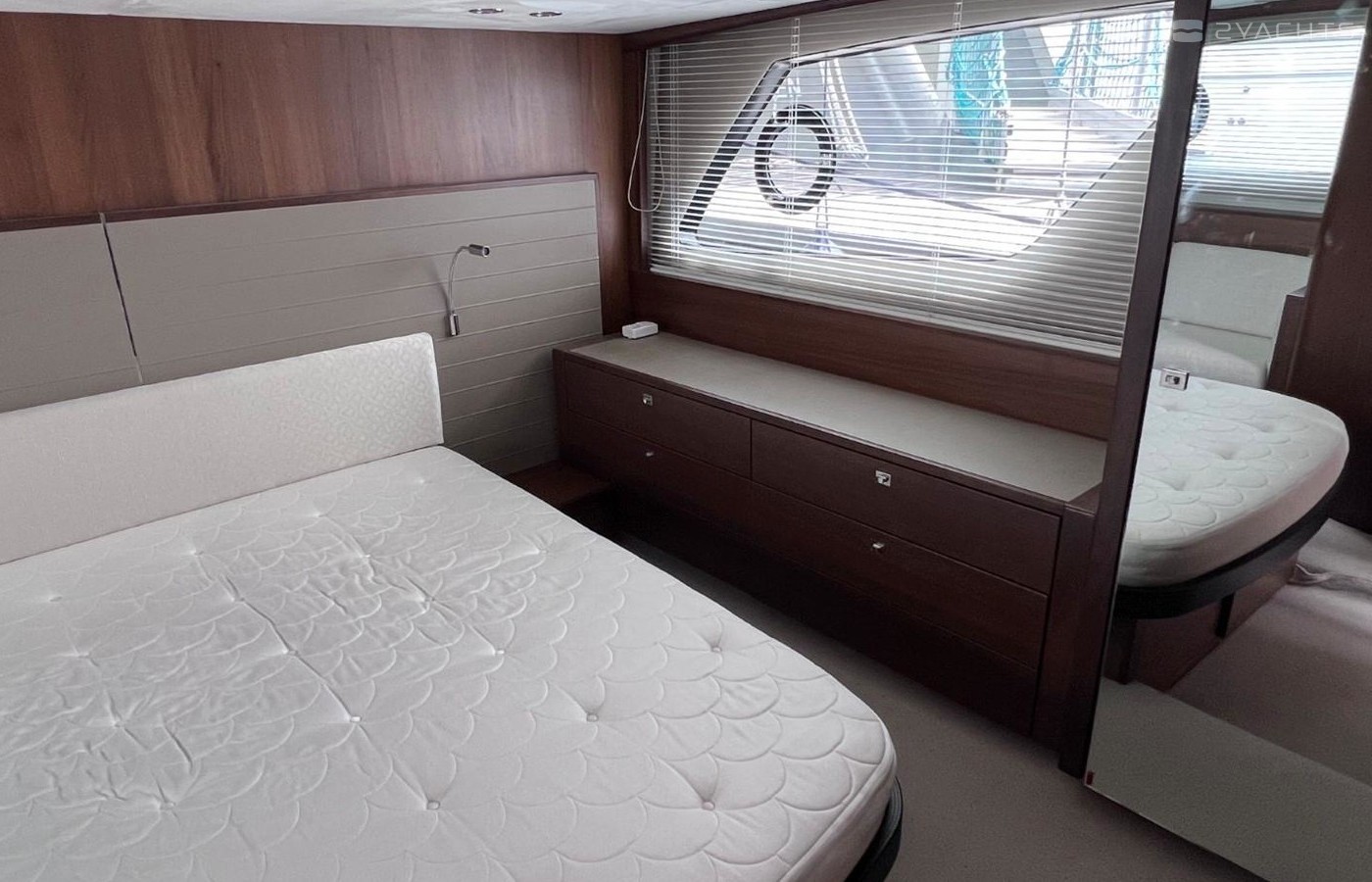 Large double bed with drawers belowWardrobe with shelvesDrawers and storage lockersOverhead and individual berth lightsSofaDressing tablePanoramic trapezoidal windows in toughened glass with opening portsEn-suite bathroom:Avonite worktopWash basin with Monobloc mixer tapSeparate stall shower with extractorMirrorStorage lockerOpening portlight