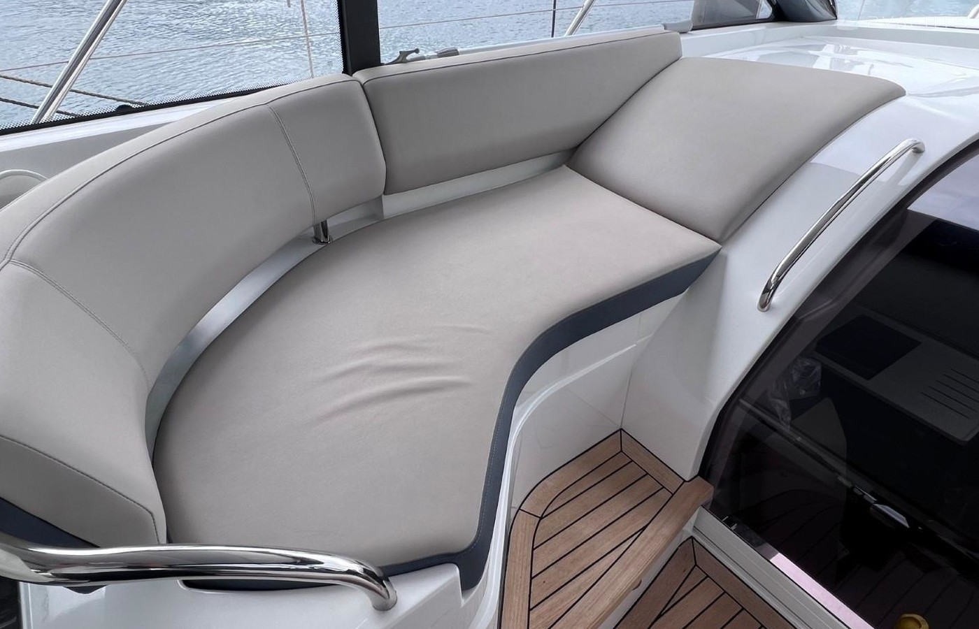 L-shaped sofaTableStorage lockersOverhead downlightersMain electrical control panel with battery isolation switchesOpening portlights (2)