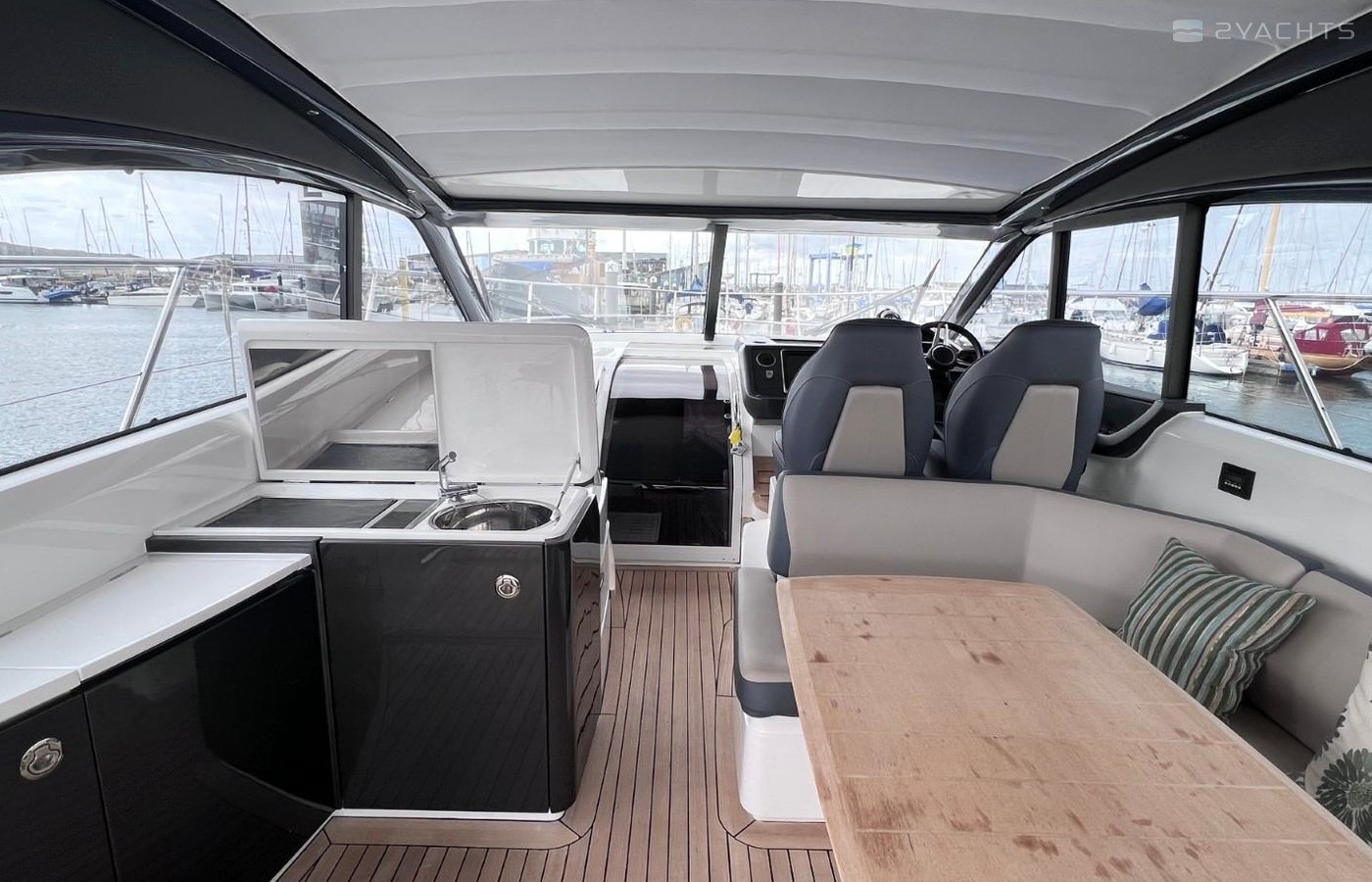 U-shaped sofaDining tableCocktail cabinetRefrigeratorOverhead downlightersElectric opening roofTriple stainless-steel framed sliding doors to cockpitRadio/CD/MP3 with saloon and cockpit speakersTimber-laid flooring
