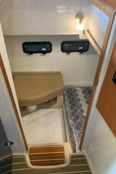 The R-31S (Sedan) shares many of the features and qualities of her smaller sisterships but some notable additions to this larger model make her ideal for extended cruising while still being a trailerable trawler. The builders at Ranger Tugs equipped the foredeck with seating and a table that can be raised or lowered depending on whether the boat is under way or at anchor or dock for entertaining. In addition to the foredeck seating, the R-31 boasts a larger cockpit area with wraparound seating utilizing seats that fold out of the gunwale. When not entertaining, seats are folded leaving the cockpit unencumbered.