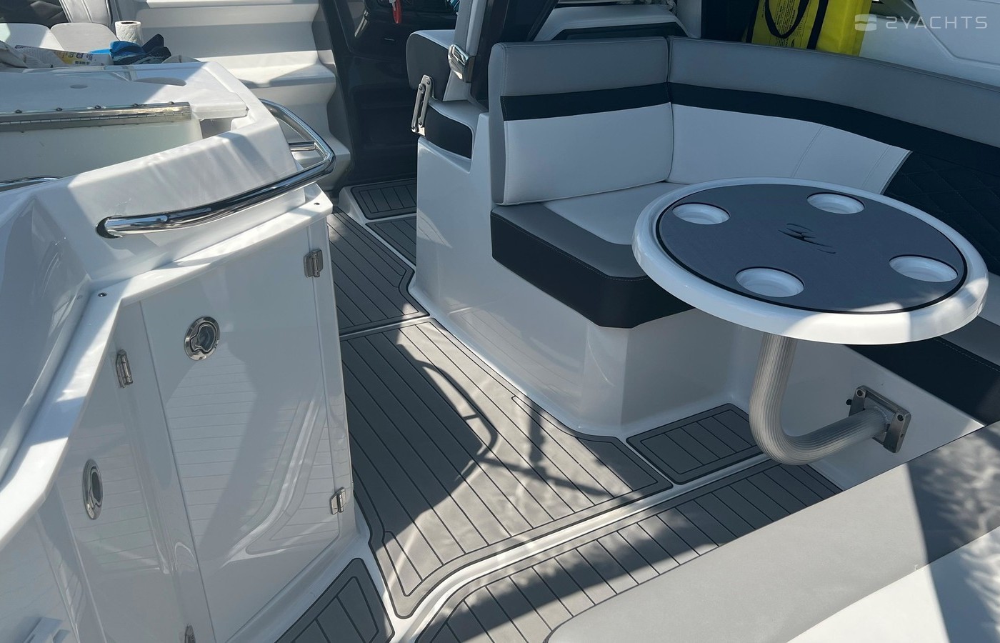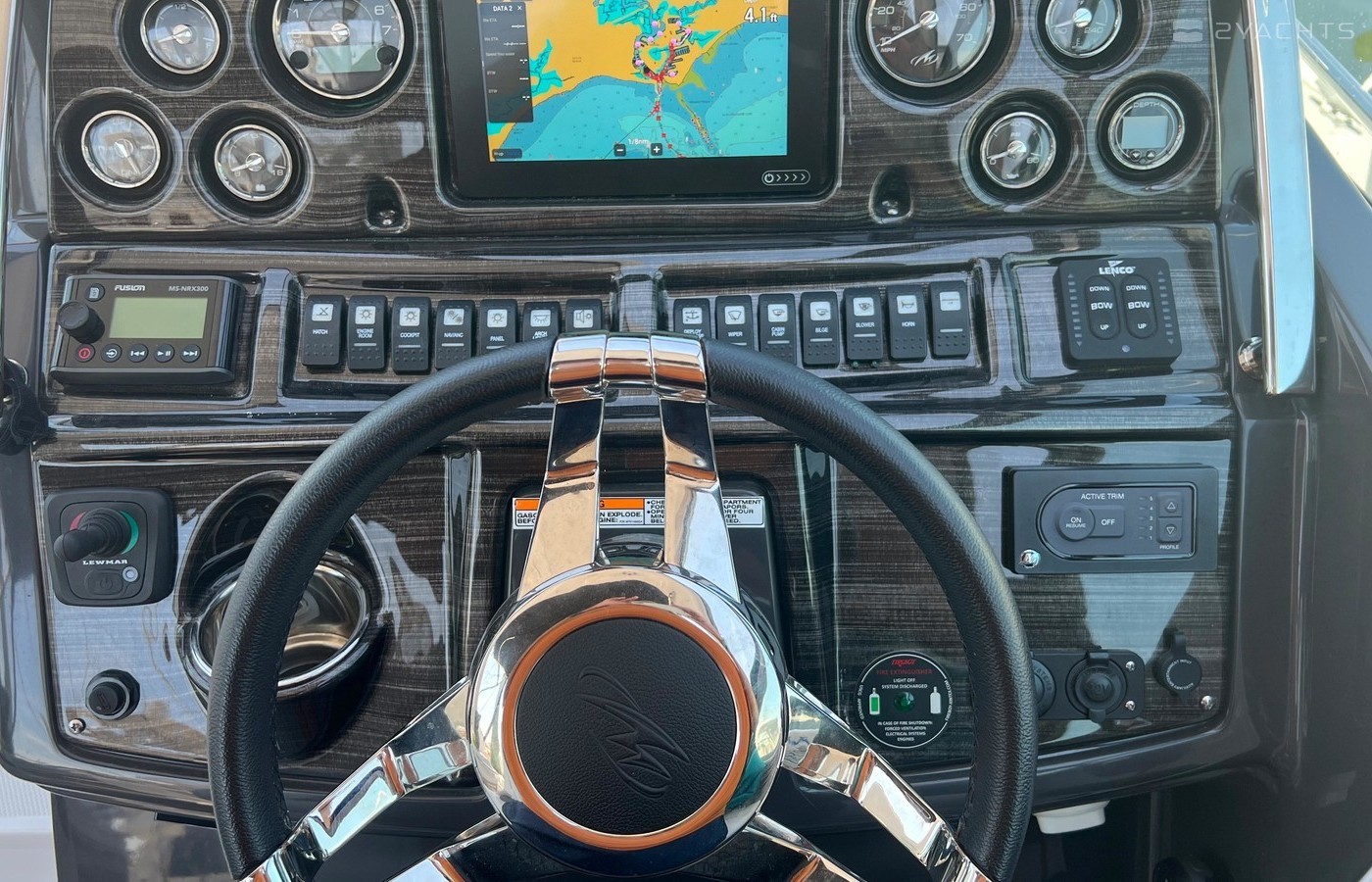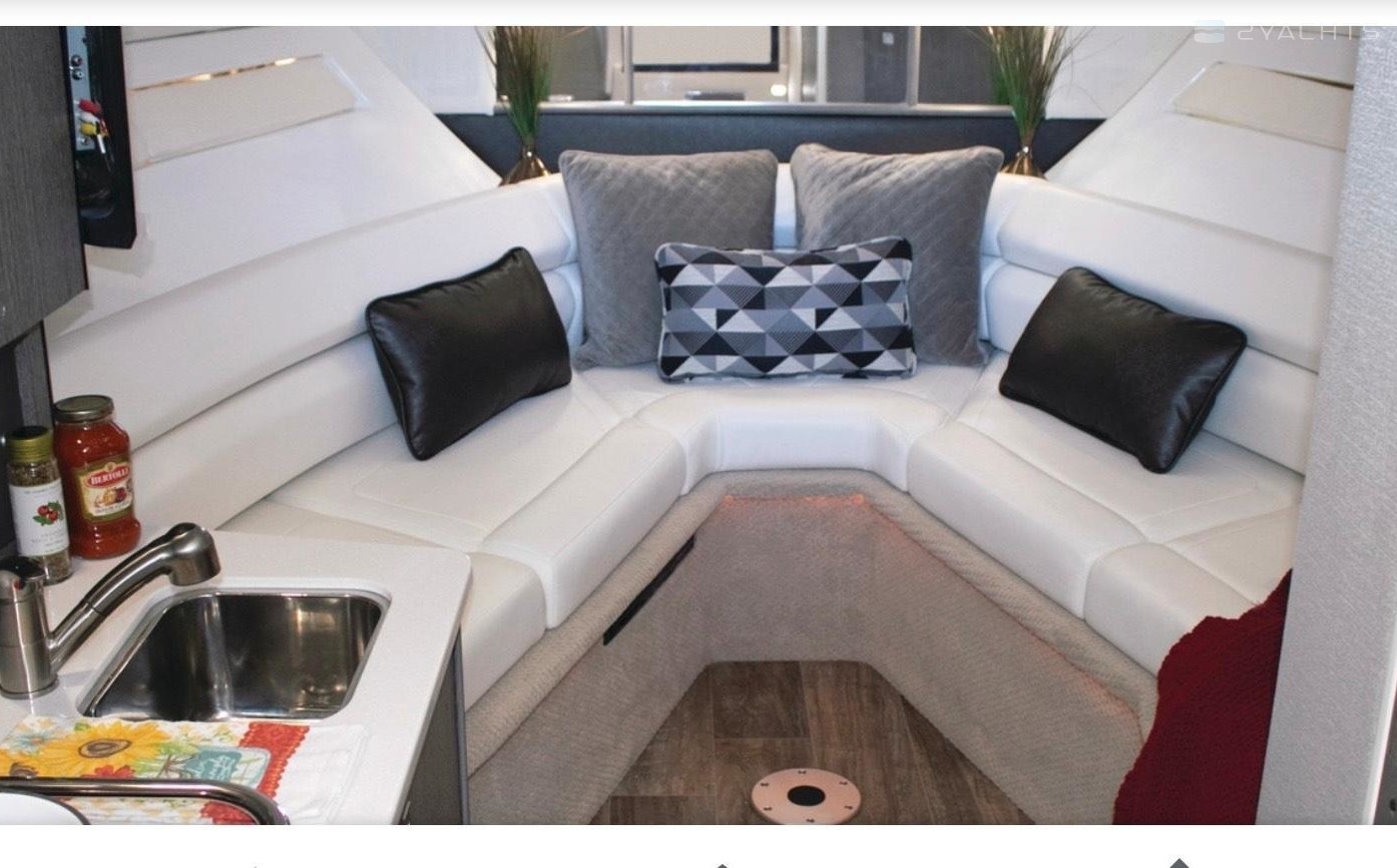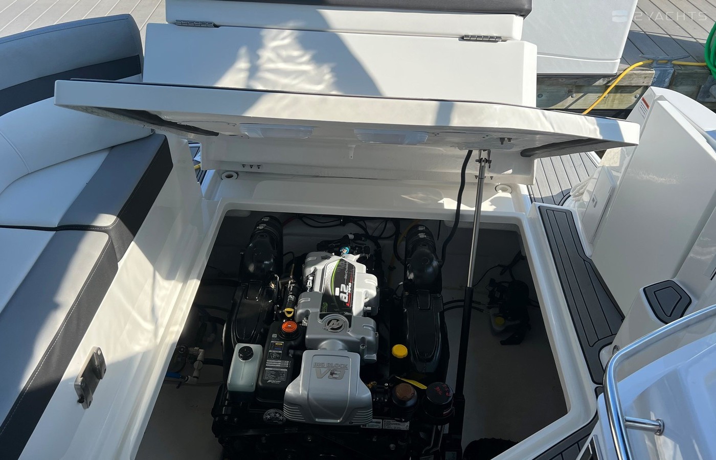 Plenty of “big boat” options including: Mercruiser 8.2 MAG MPI CAT DTS, with Bravo 3 Outdrive, Bow Thruster, Seadek Inlay throughout Swim Platform and Cockpit, Cockpit Refrigerator & Wet Bar, 2 Berths, Head/Shower combo, Underwater LED lights, Stainless Steel Windlass Anchor, Active Trim, Ray Marine 90VHF, GPS AX9/ChartPlotter, LED 19’ Flat Screen TV & DVD Player, Solid Wood Dinette Table, AC with Reverse Cycle Heat, Cockpit Grill, Transom hot/cold shower, Full Canvas and much more …
