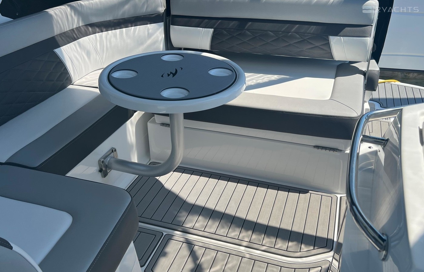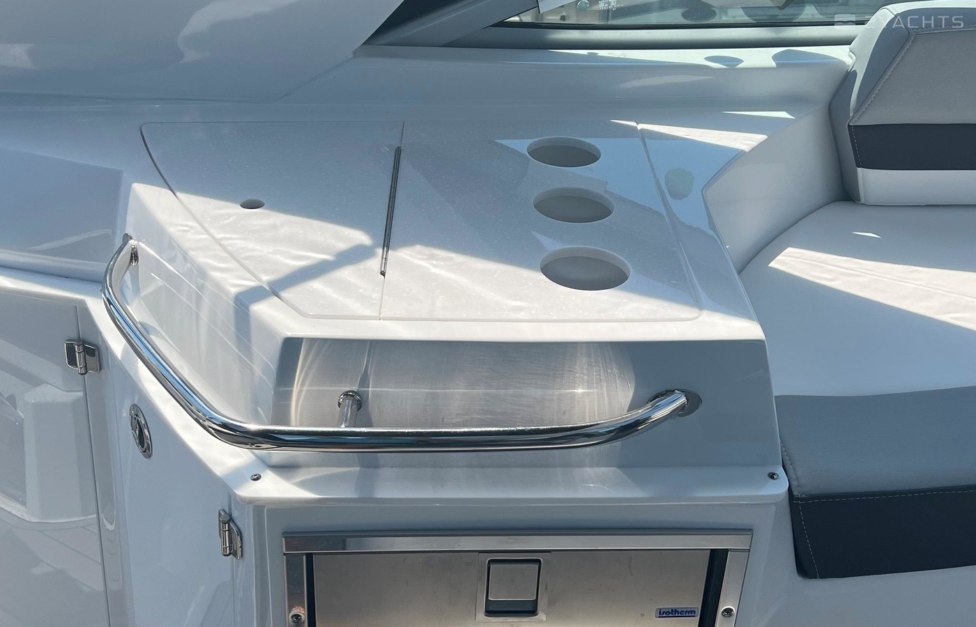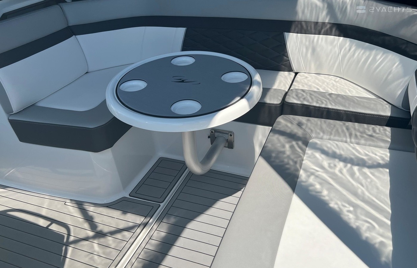 Plenty of “big boat” options including: Mercruiser 8.2 MAG MPI CAT DTS, with Bravo 3 Outdrive, Bow Thruster, Seadek Inlay throughout Swim Platform and Cockpit, Cockpit Refrigerator & Wet Bar, 2 Berths, Head/Shower combo, Underwater LED lights, Stainless Steel Windlass Anchor, Active Trim, Ray Marine 90VHF, GPS AX9/ChartPlotter, LED 19’ Flat Screen TV & DVD Player, Solid Wood Dinette Table, AC with Reverse Cycle Heat, Cockpit Grill, Transom hot/cold shower, Full Canvas and much more …