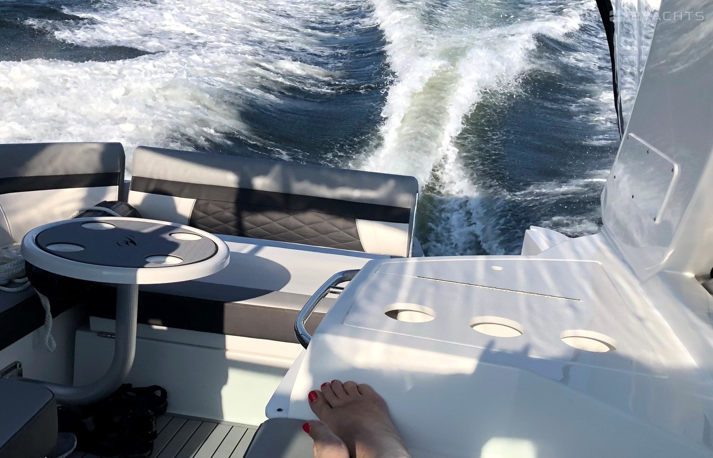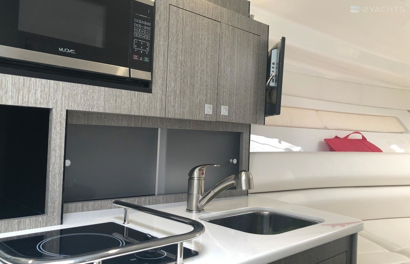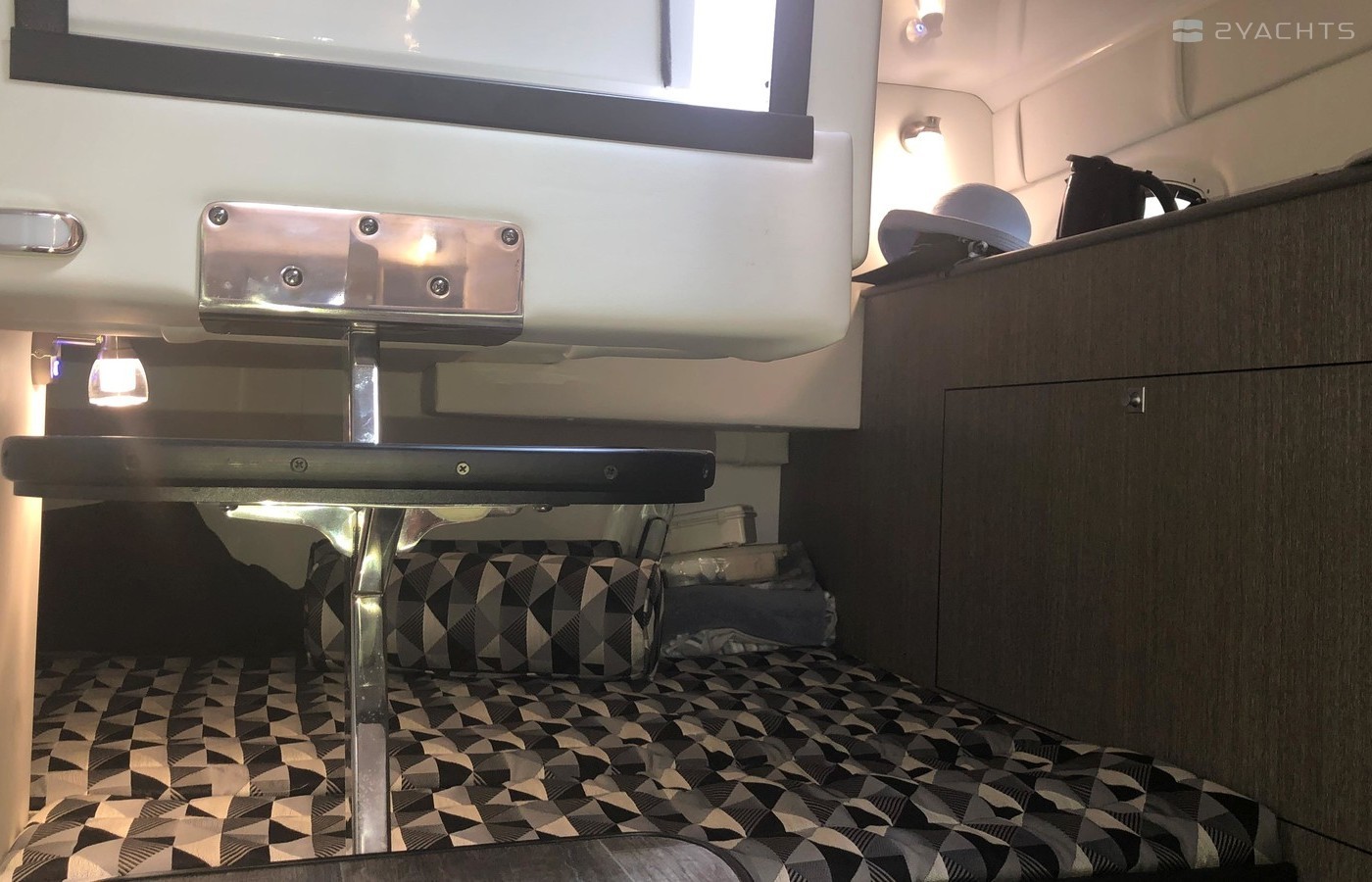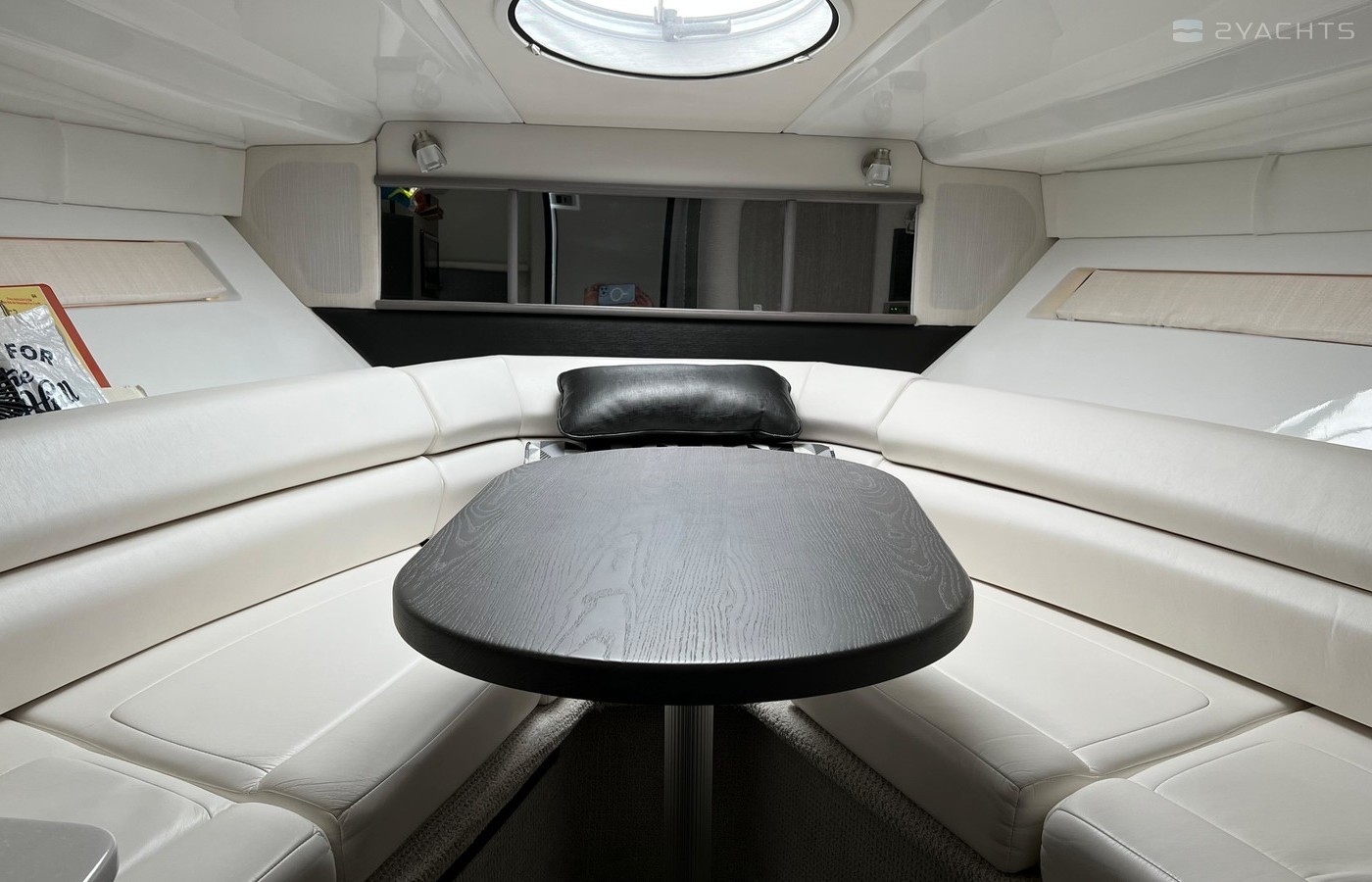 Plenty of “big boat” options including: Mercruiser 8.2 MAG MPI CAT DTS, with Bravo 3 Outdrive, Bow Thruster, Seadek Inlay throughout Swim Platform and Cockpit, Cockpit Refrigerator & Wet Bar, 2 Berths, Head/Shower combo, Underwater LED lights, Stainless Steel Windlass Anchor, Active Trim, Ray Marine 90VHF, GPS AX9/ChartPlotter, LED 19’ Flat Screen TV & DVD Player, Solid Wood Dinette Table, AC with Reverse Cycle Heat, Cockpit Grill, Transom hot/cold shower, Full Canvas and much more …