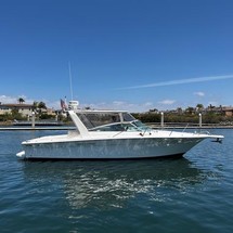 Fast, clean looking express cruiser built on a moderate (18 degree deadrise) vee-d hull. She handles well in a variety of sea conditions and gets up and goes in fair water.
