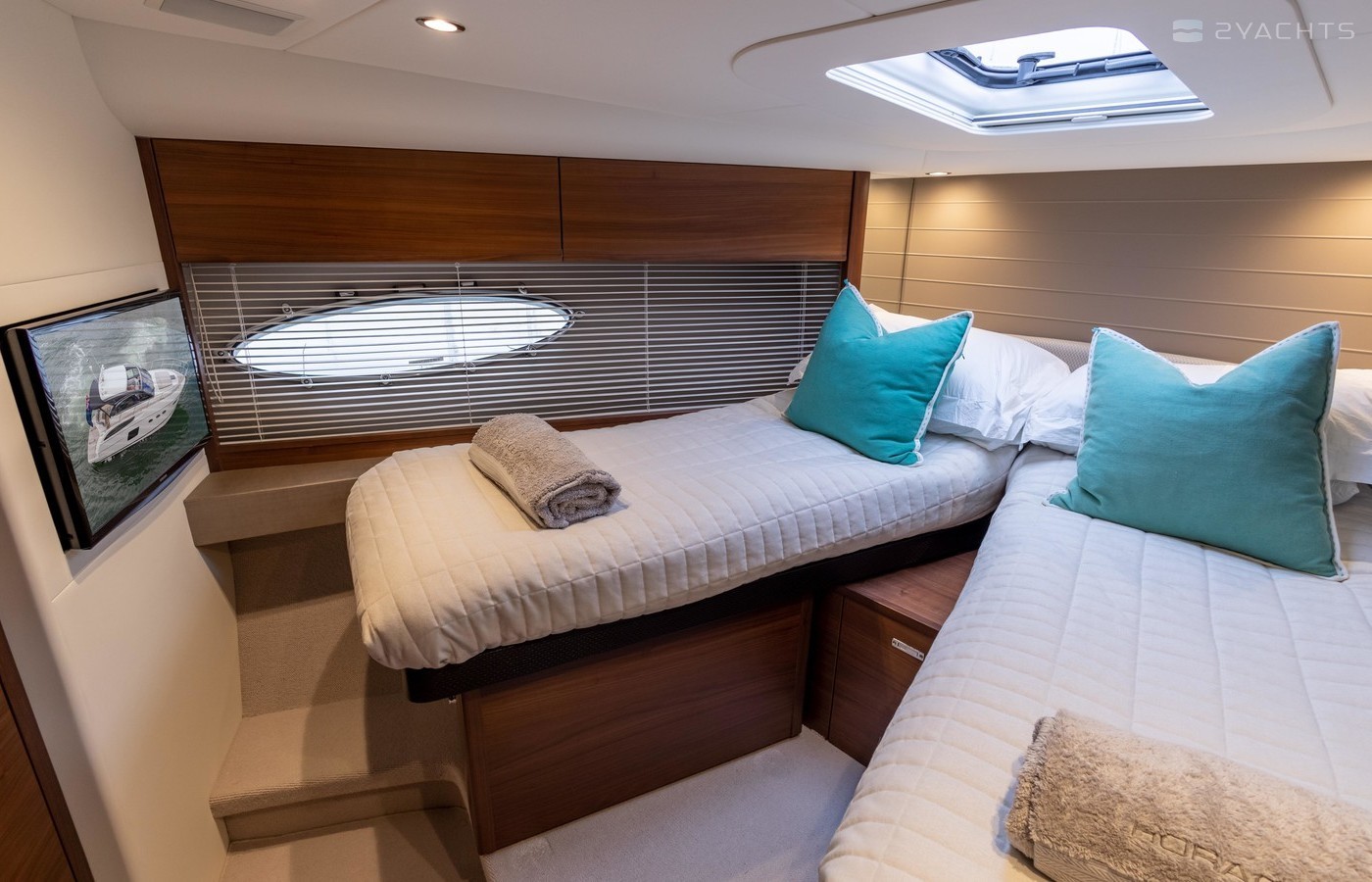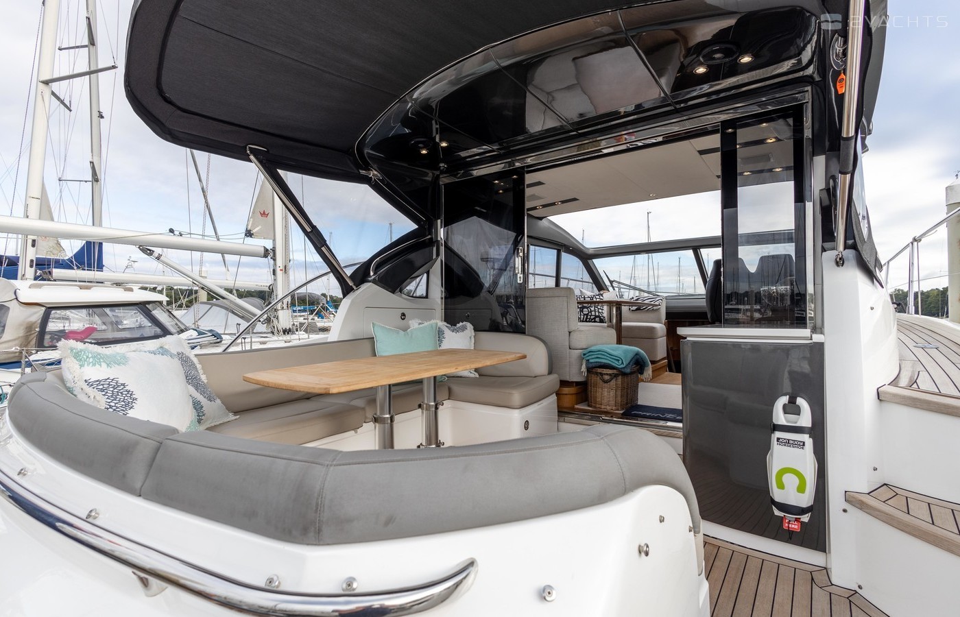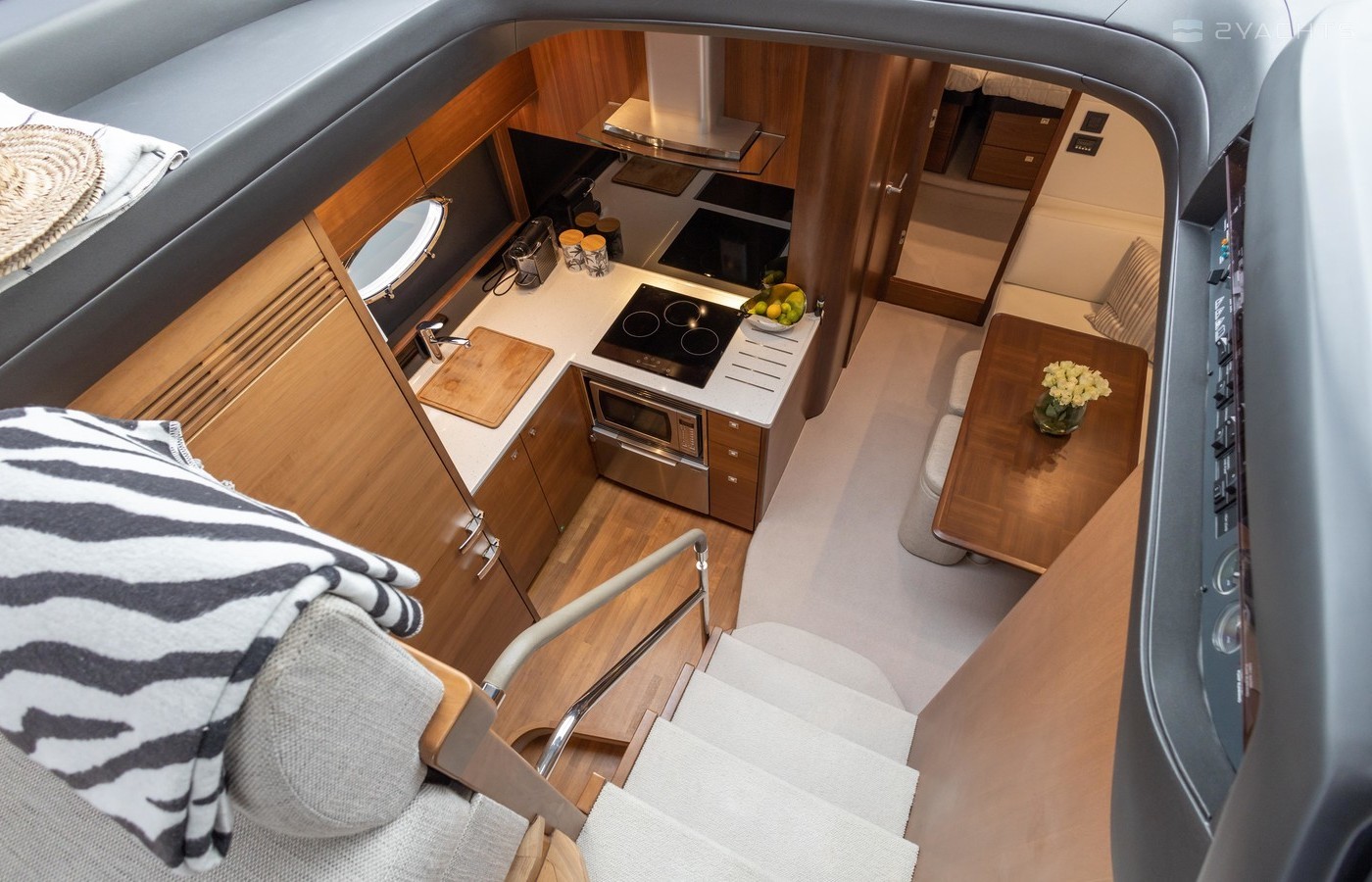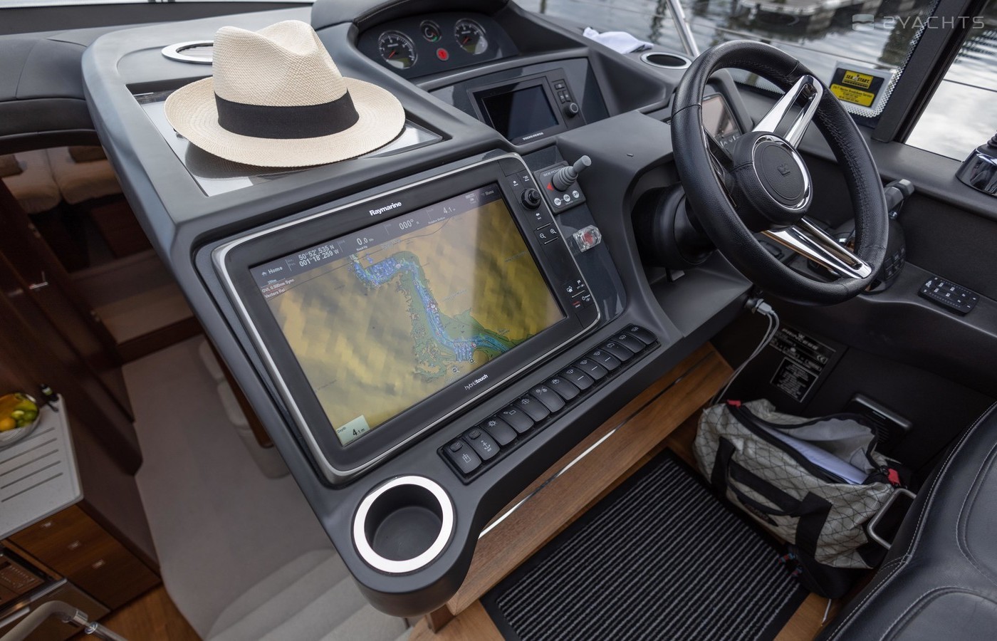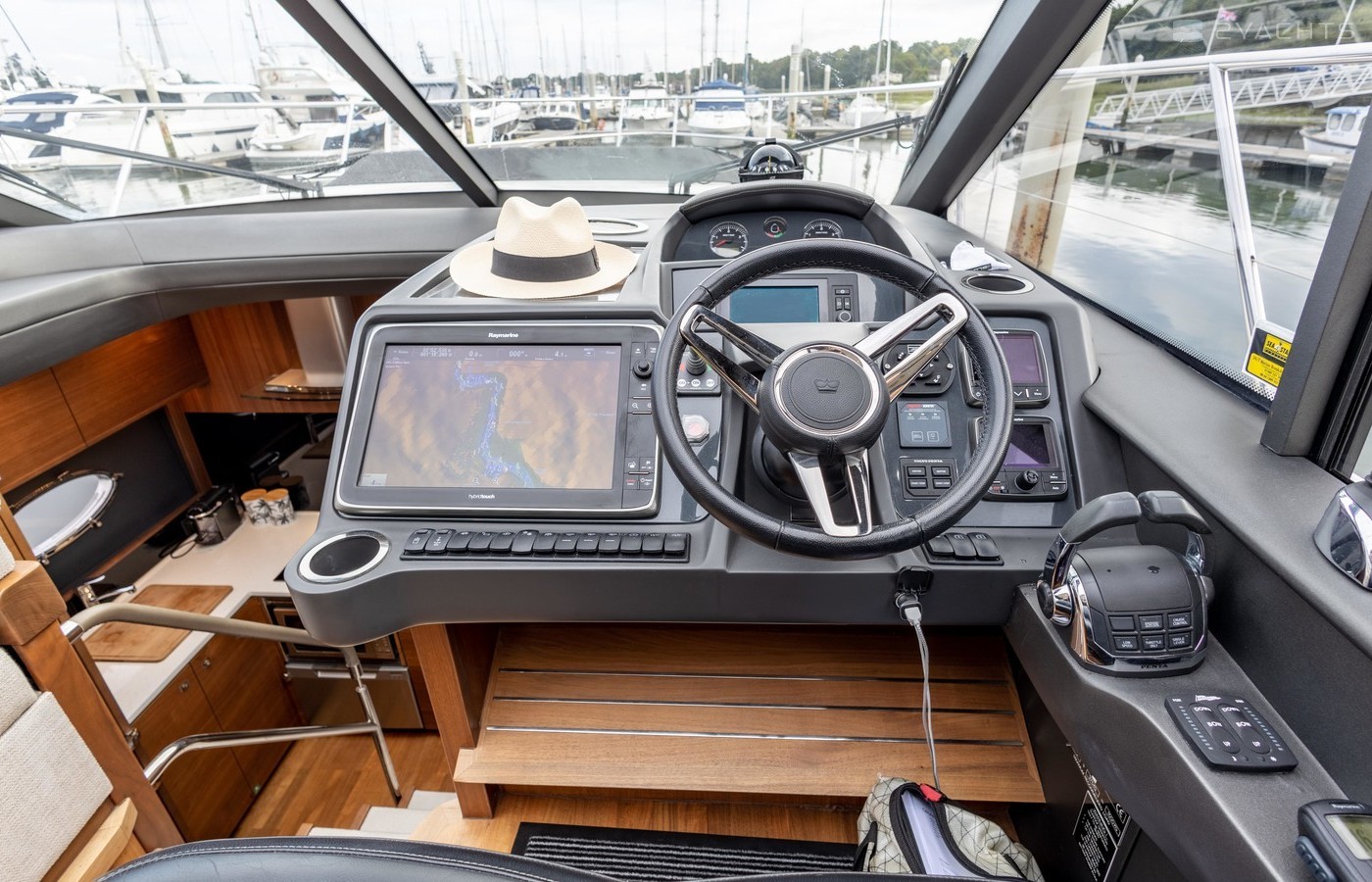 Twin Volvo IPS 600 435hp diesel engines • Volvo joystick control • White hull • Walnut interior woodwork, satin finish • Ice crystal white galley worktop • Raymarine e165 chart plotter and GPS • Raymarine p70r autopilot and rate gyro • Bow thruster • Onan 11kW diesel generator • Reverse cycle air-conditioning • Holding tank • Teak laid cockpit, foredeck and side decks • Cockpit wetbar with sink, electric BBQ and storage • Electro-hydraulic bathing platform • Cockpit sun awning