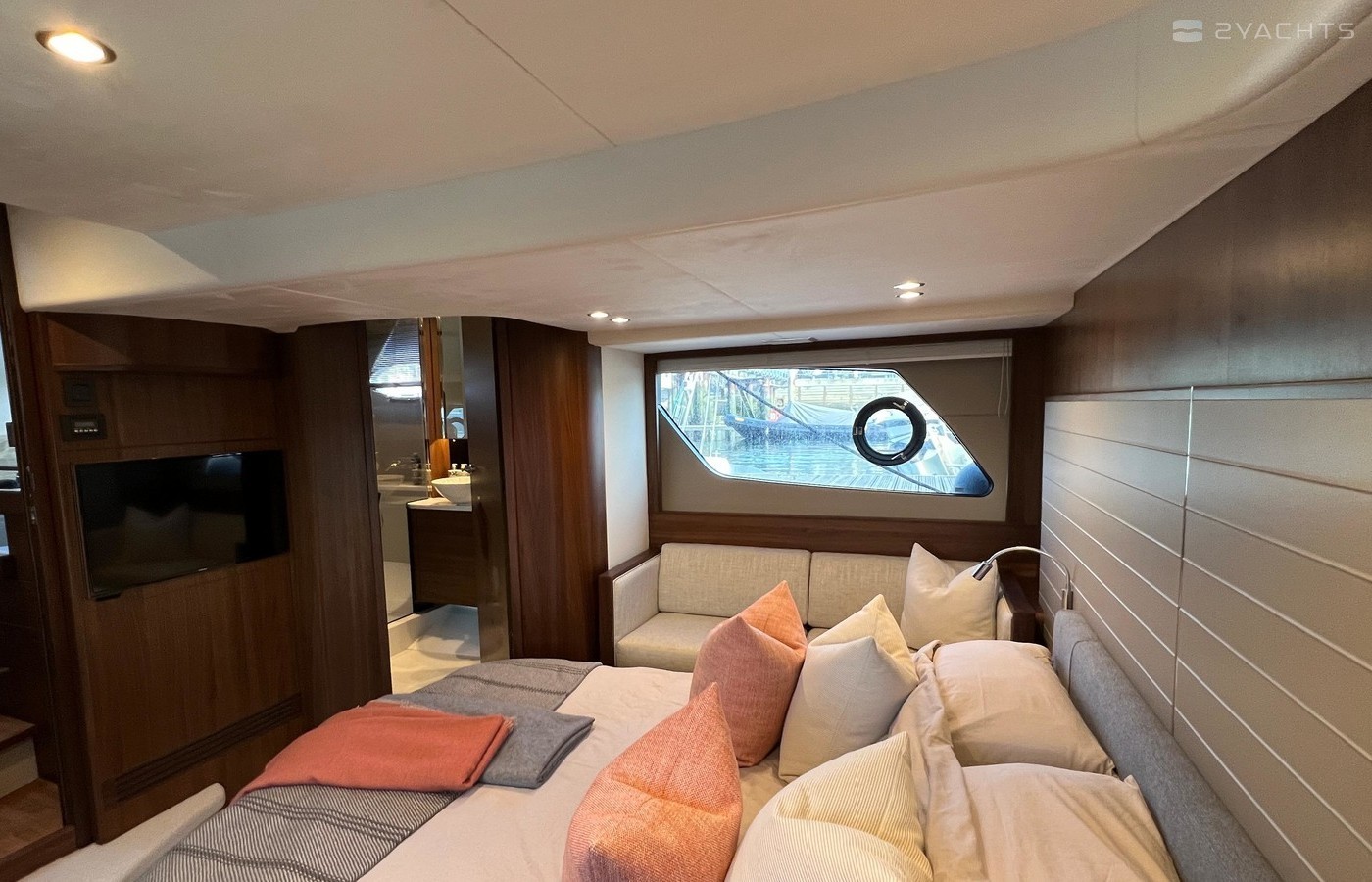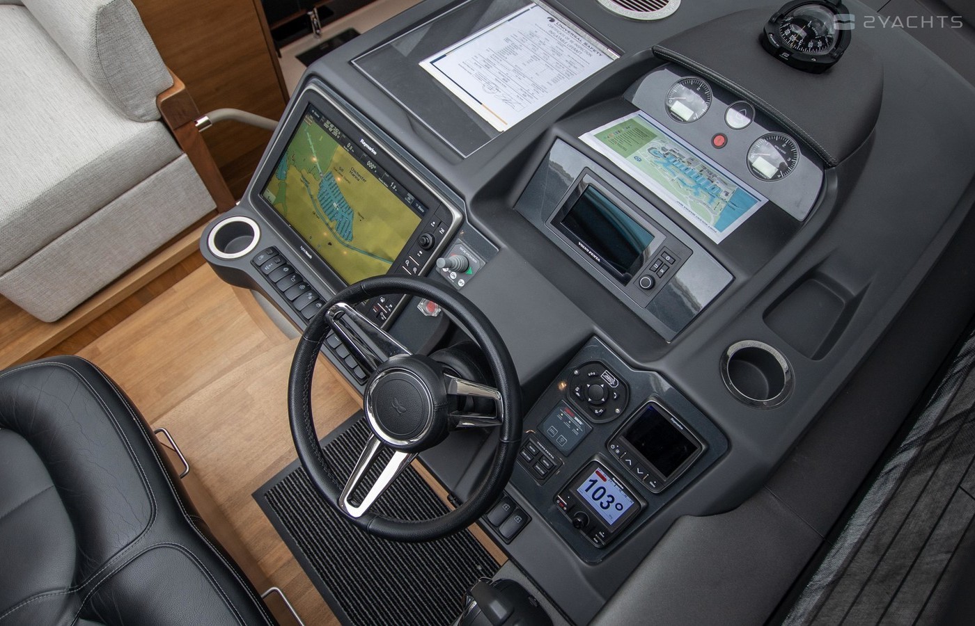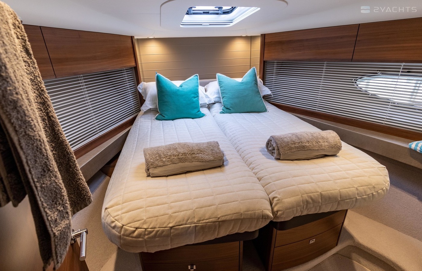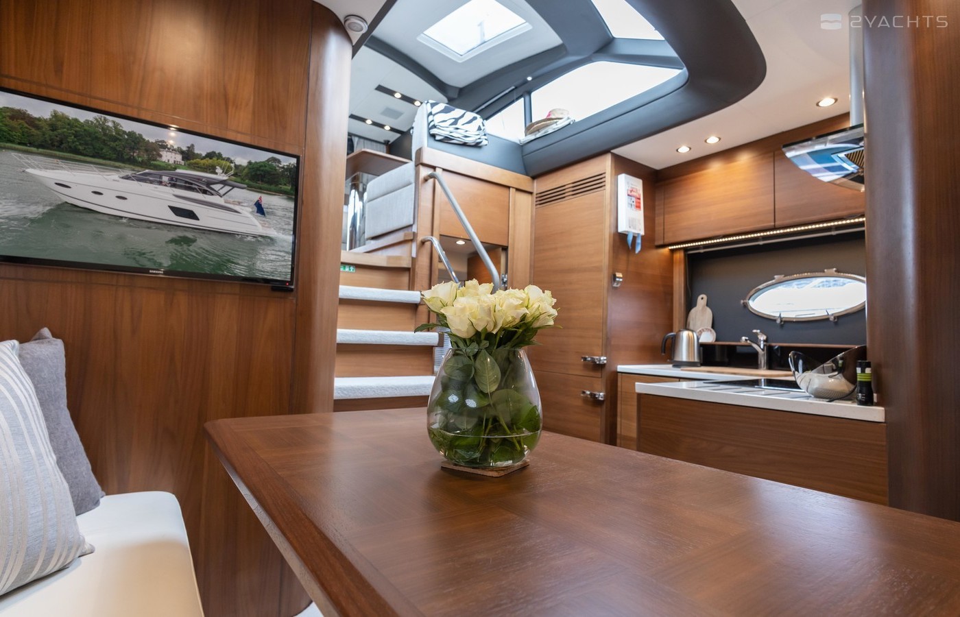 Twin Volvo IPS 600 435hp diesel engines • Volvo joystick control • White hull • Walnut interior woodwork, satin finish • Ice crystal white galley worktop • Raymarine e165 chart plotter and GPS • Raymarine p70r autopilot and rate gyro • Bow thruster • Onan 11kW diesel generator • Reverse cycle air-conditioning • Holding tank • Teak laid cockpit, foredeck and side decks • Cockpit wetbar with sink, electric BBQ and storage • Electro-hydraulic bathing platform • Cockpit sun awning