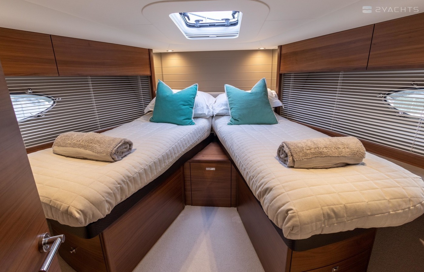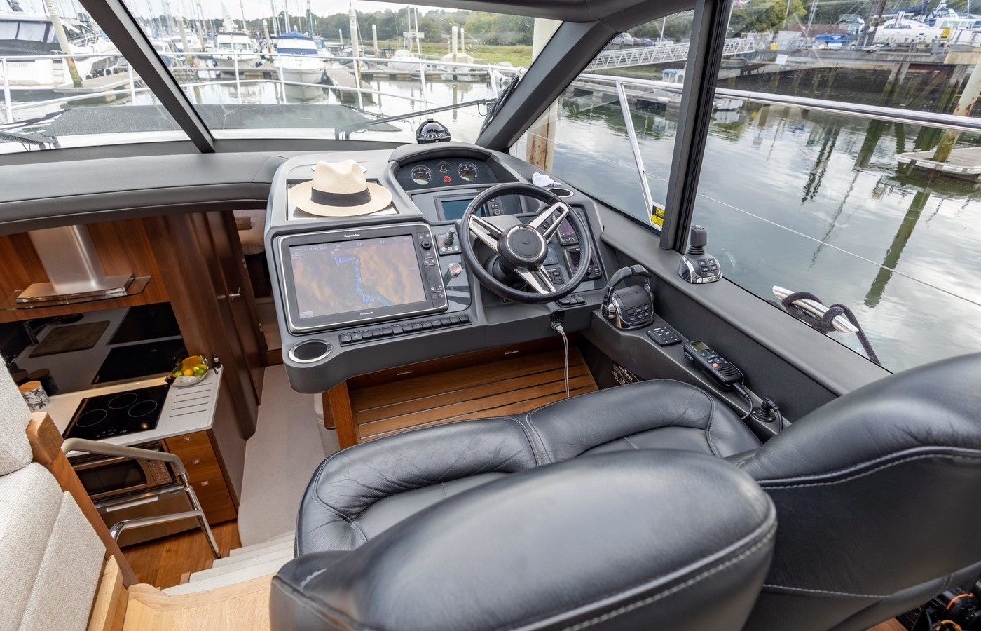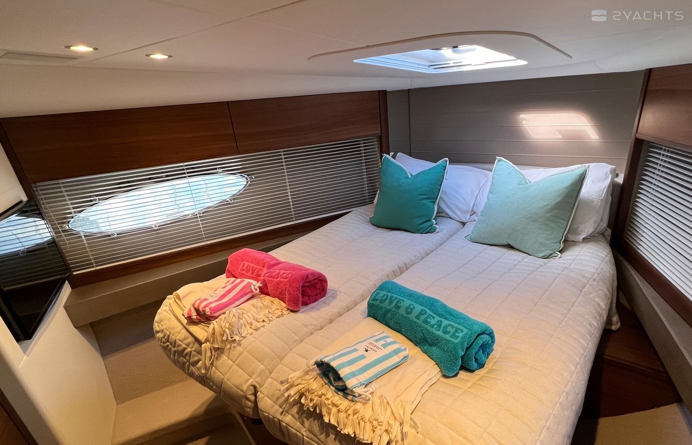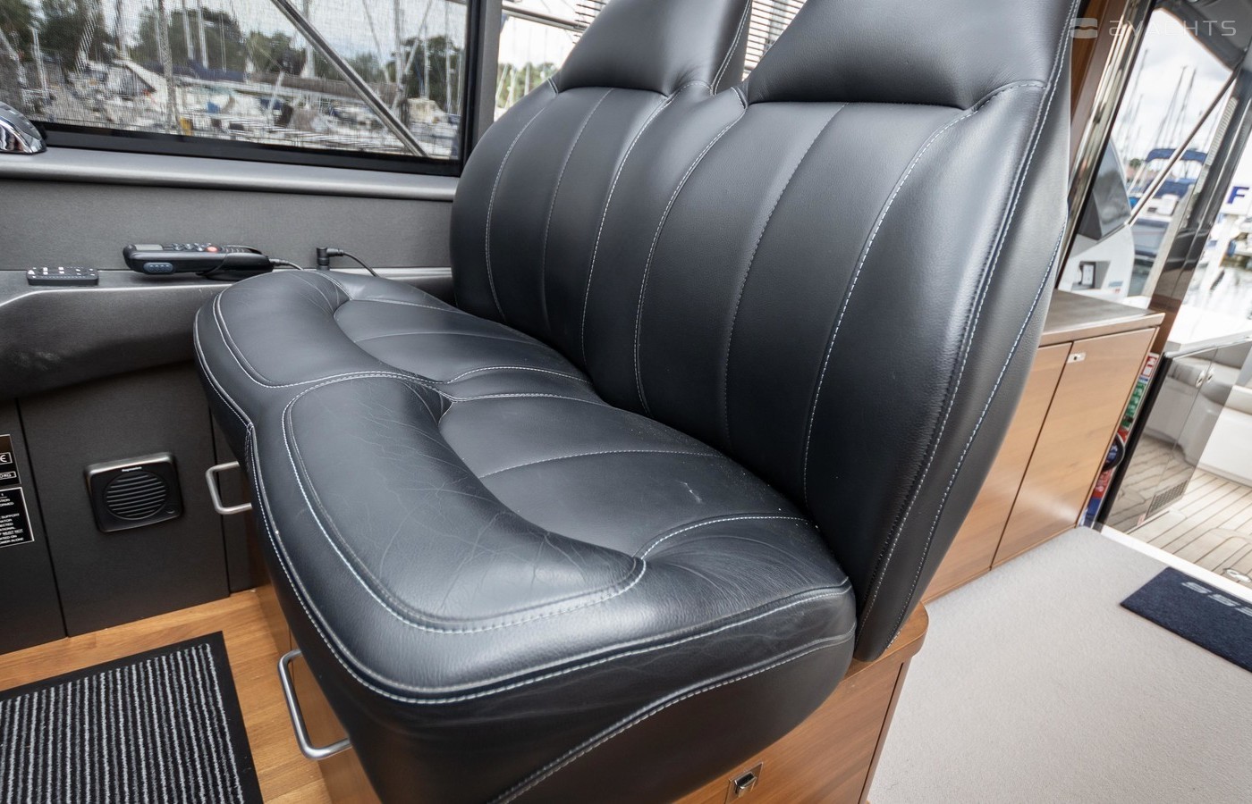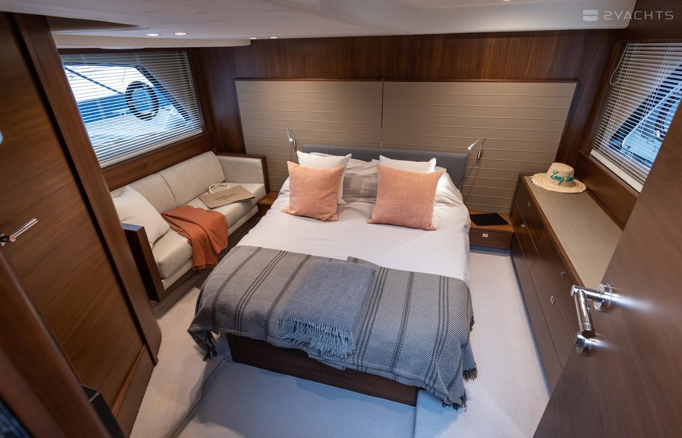 Twin Volvo IPS 600 435hp diesel engines • Volvo joystick control • White hull • Walnut interior woodwork, satin finish • Ice crystal white galley worktop • Raymarine e165 chart plotter and GPS • Raymarine p70r autopilot and rate gyro • Bow thruster • Onan 11kW diesel generator • Reverse cycle air-conditioning • Holding tank • Teak laid cockpit, foredeck and side decks • Cockpit wetbar with sink, electric BBQ and storage • Electro-hydraulic bathing platform • Cockpit sun awning