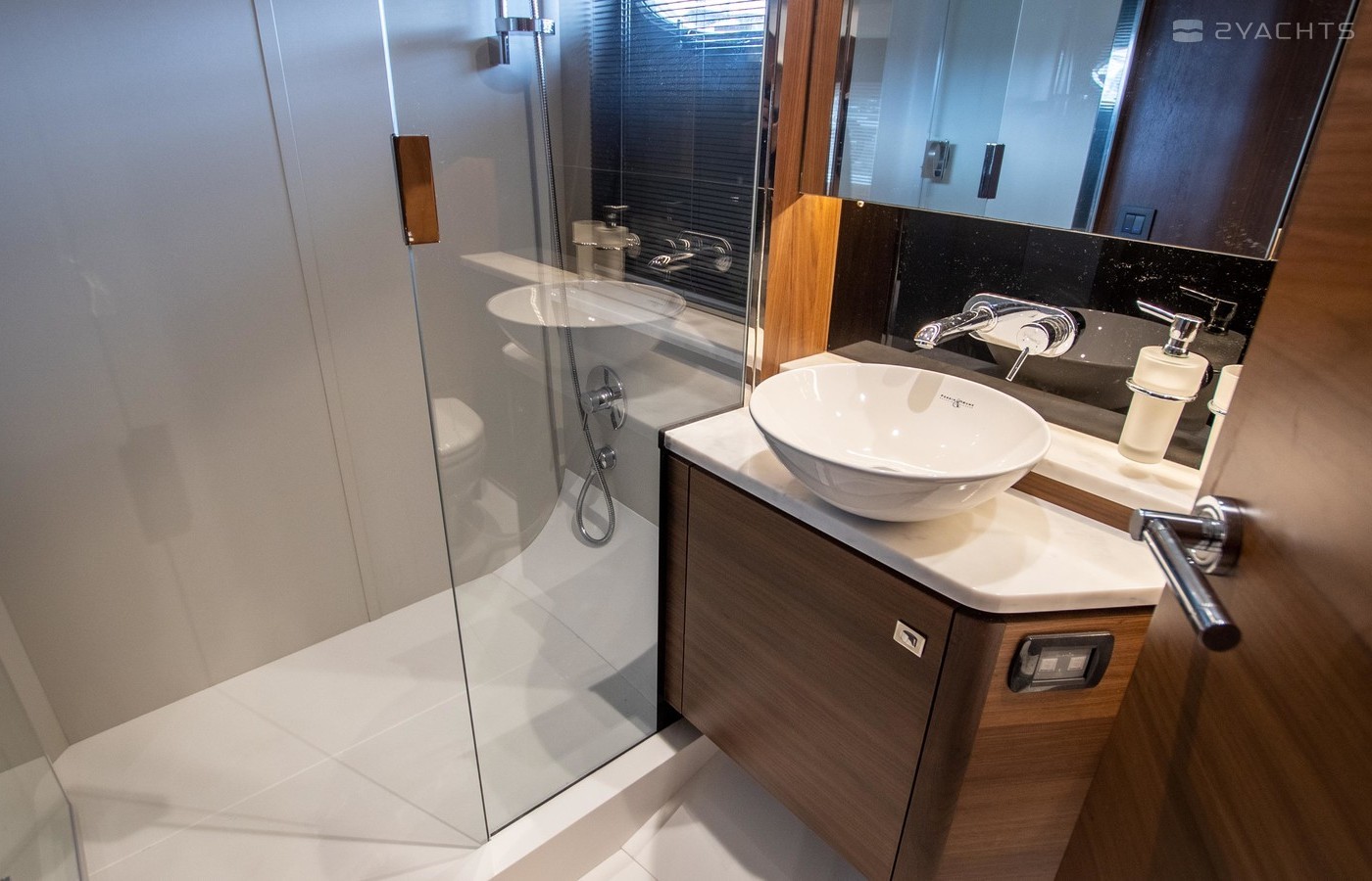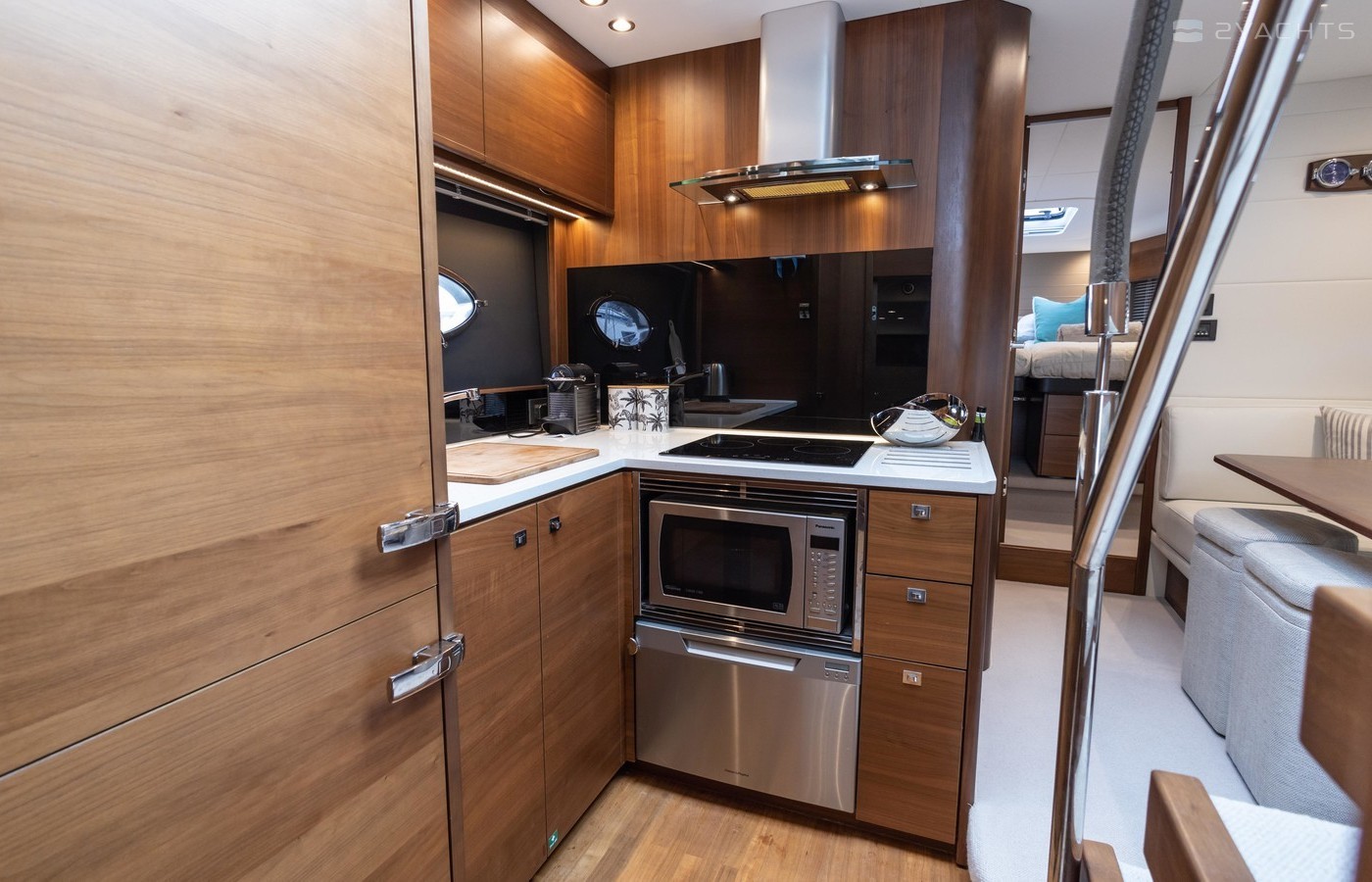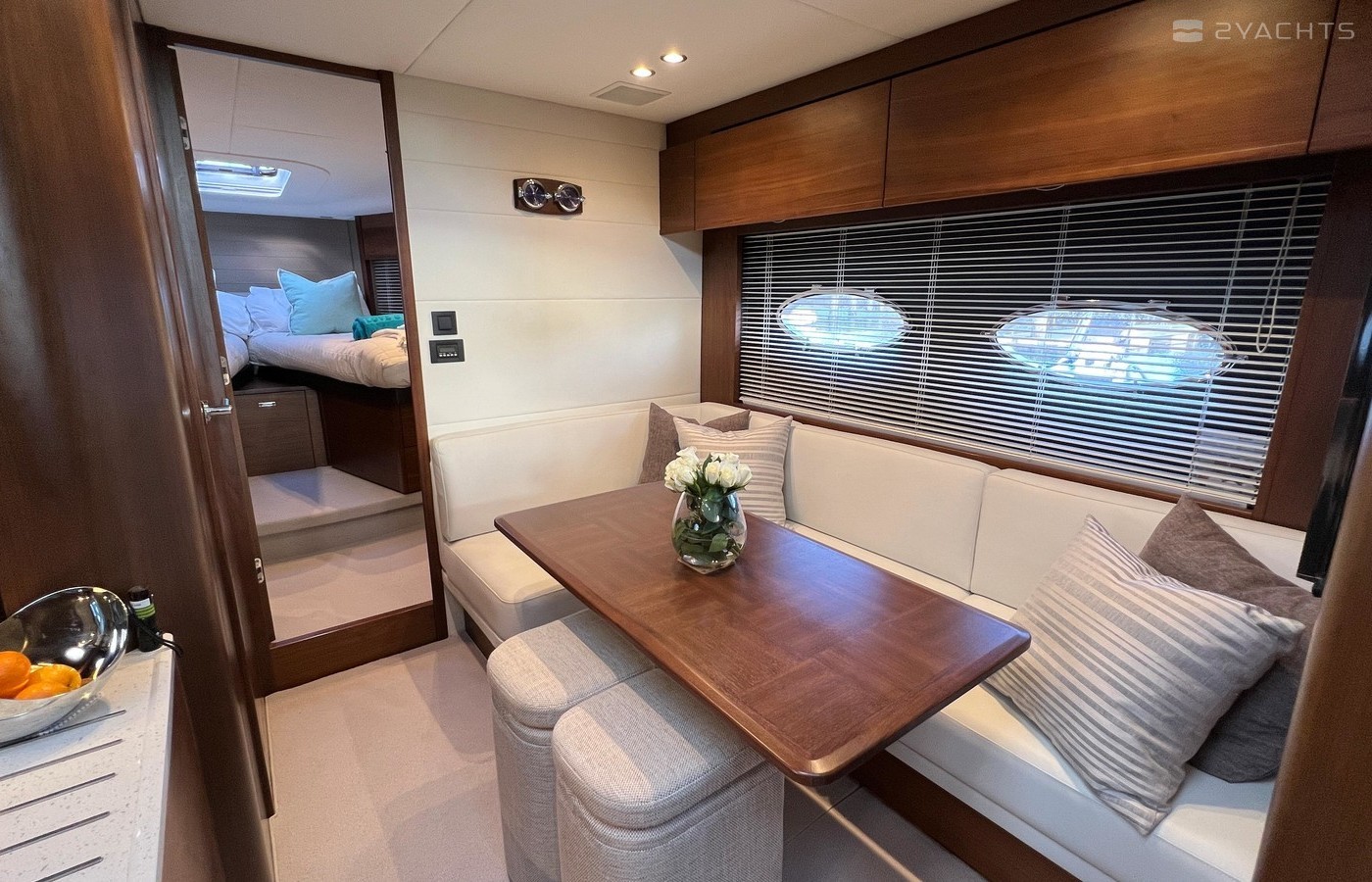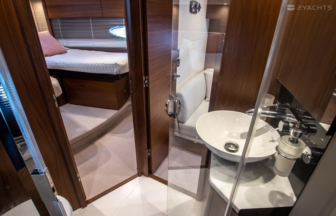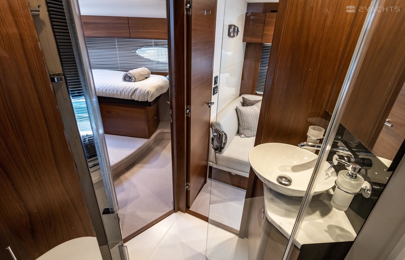 Twin Volvo IPS 600 435hp diesel engines • Volvo joystick control • White hull • Walnut interior woodwork, satin finish • Ice crystal white galley worktop • Raymarine e165 chart plotter and GPS • Raymarine p70r autopilot and rate gyro • Bow thruster • Onan 11kW diesel generator • Reverse cycle air-conditioning • Holding tank • Teak laid cockpit, foredeck and side decks • Cockpit wetbar with sink, electric BBQ and storage • Electro-hydraulic bathing platform • Cockpit sun awning