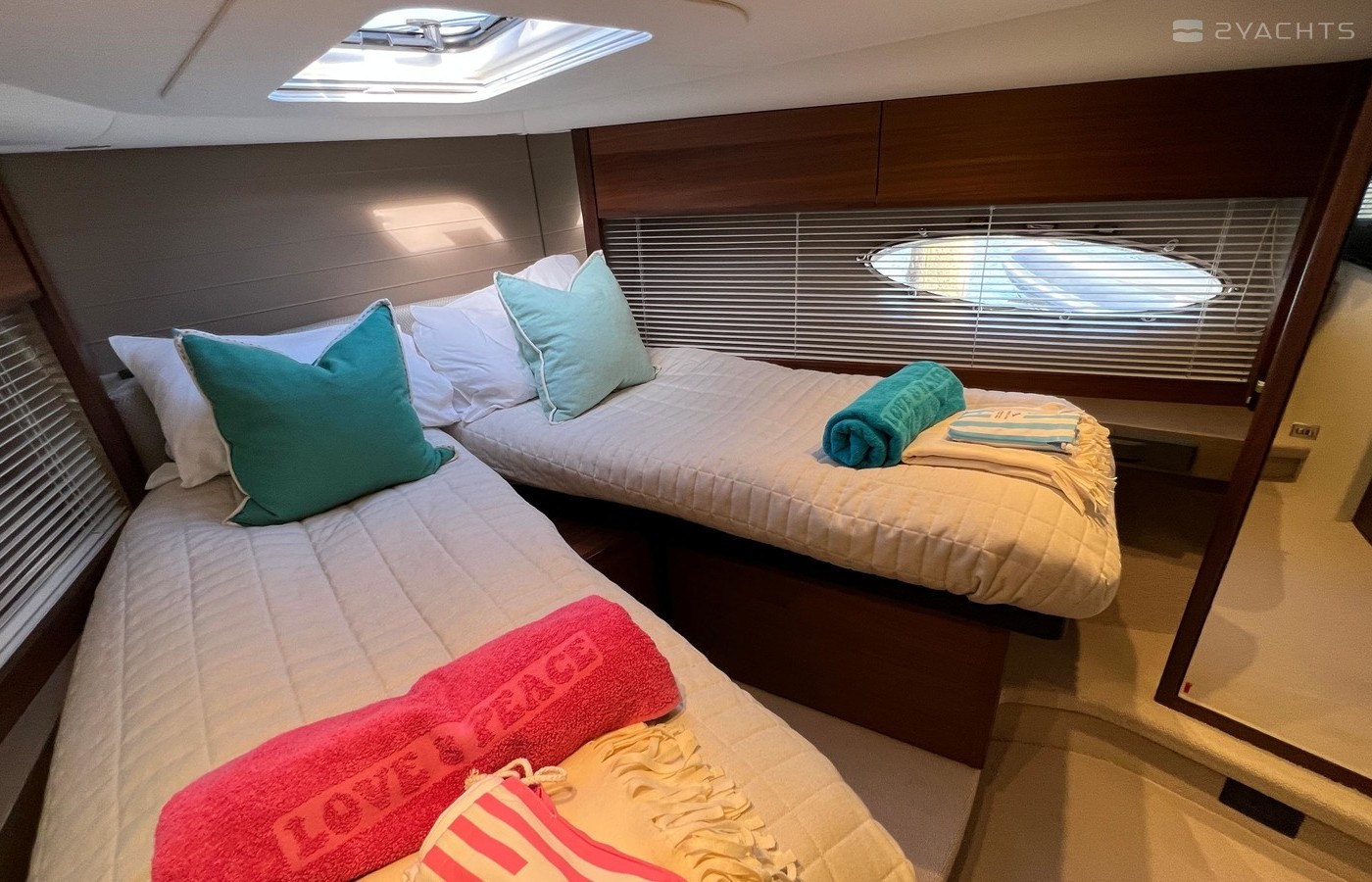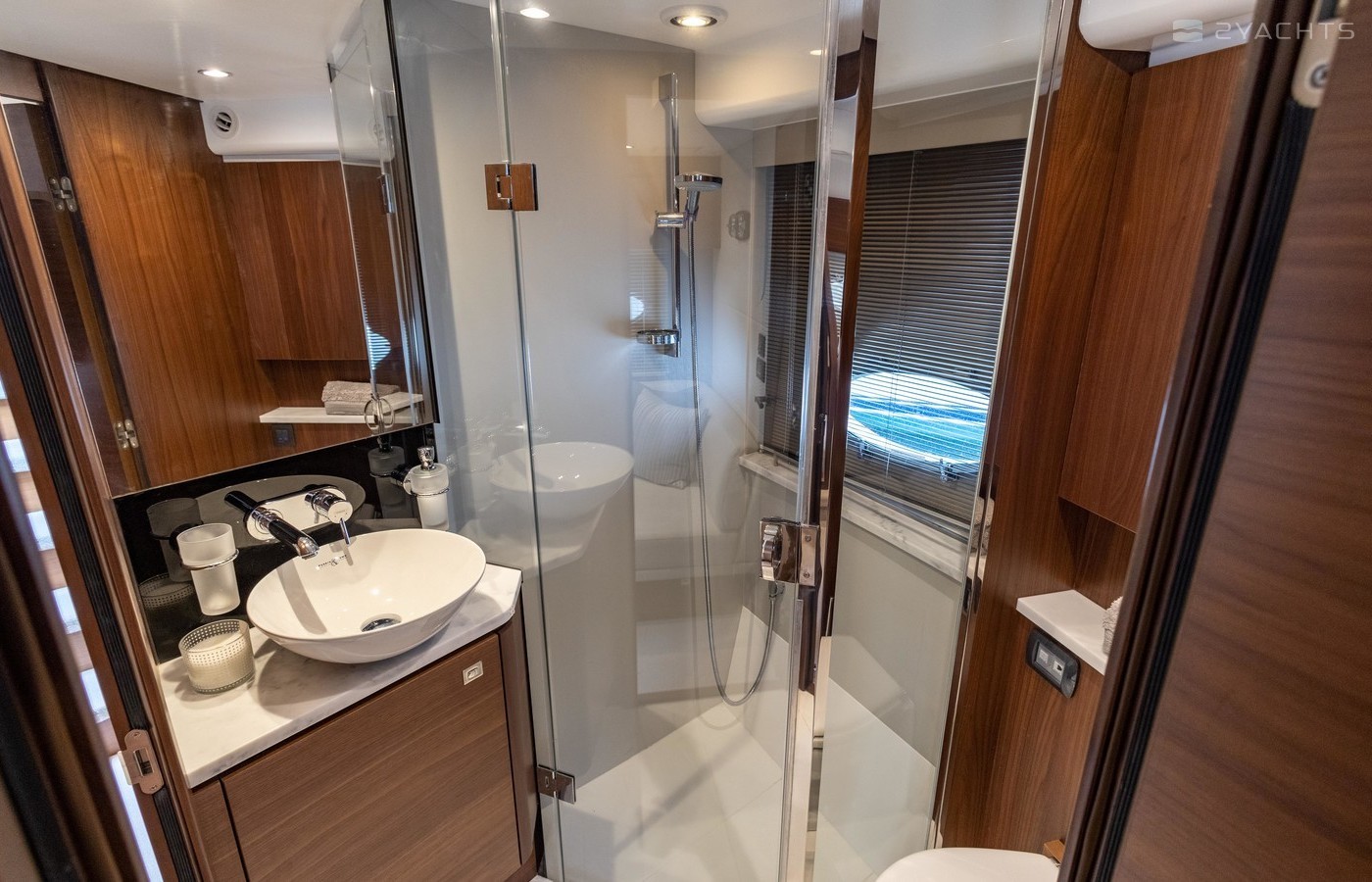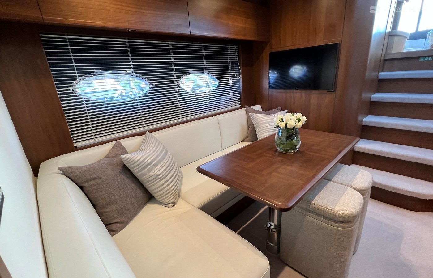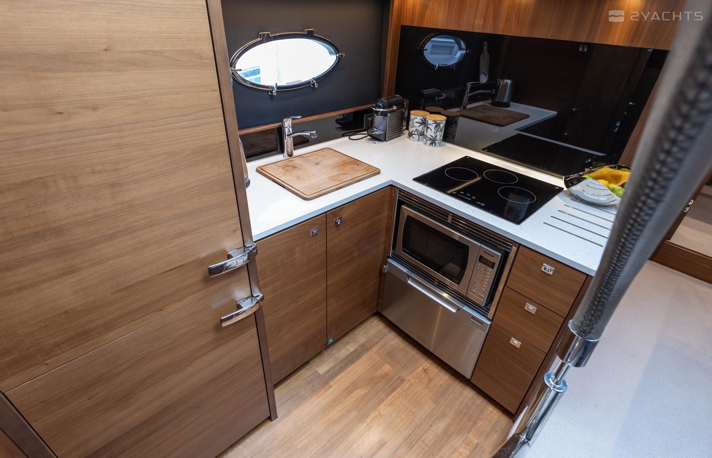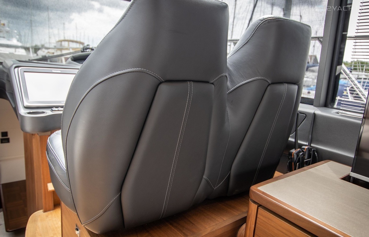 Twin Volvo IPS 600 435hp diesel engines • Volvo joystick control • White hull • Walnut interior woodwork, satin finish • Ice crystal white galley worktop • Raymarine e165 chart plotter and GPS • Raymarine p70r autopilot and rate gyro • Bow thruster • Onan 11kW diesel generator • Reverse cycle air-conditioning • Holding tank • Teak laid cockpit, foredeck and side decks • Cockpit wetbar with sink, electric BBQ and storage • Electro-hydraulic bathing platform • Cockpit sun awning