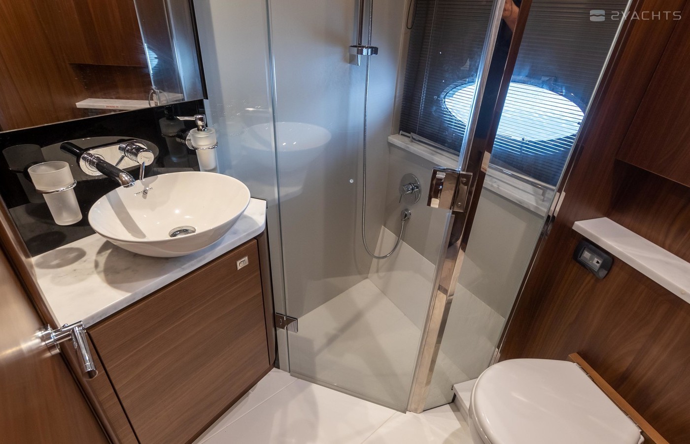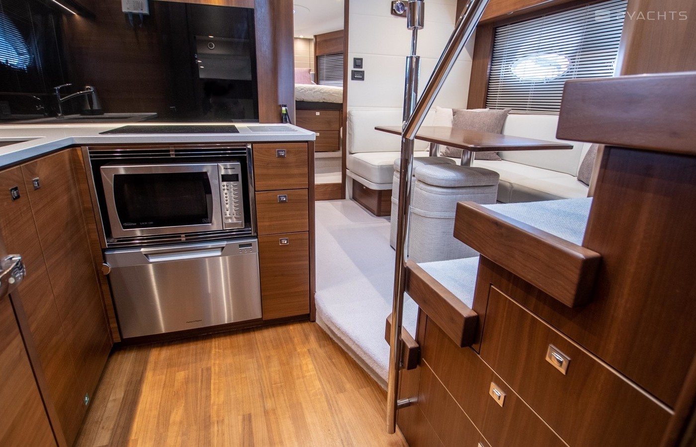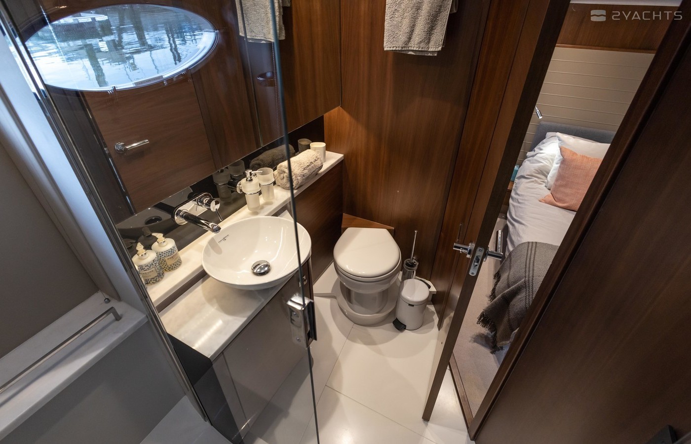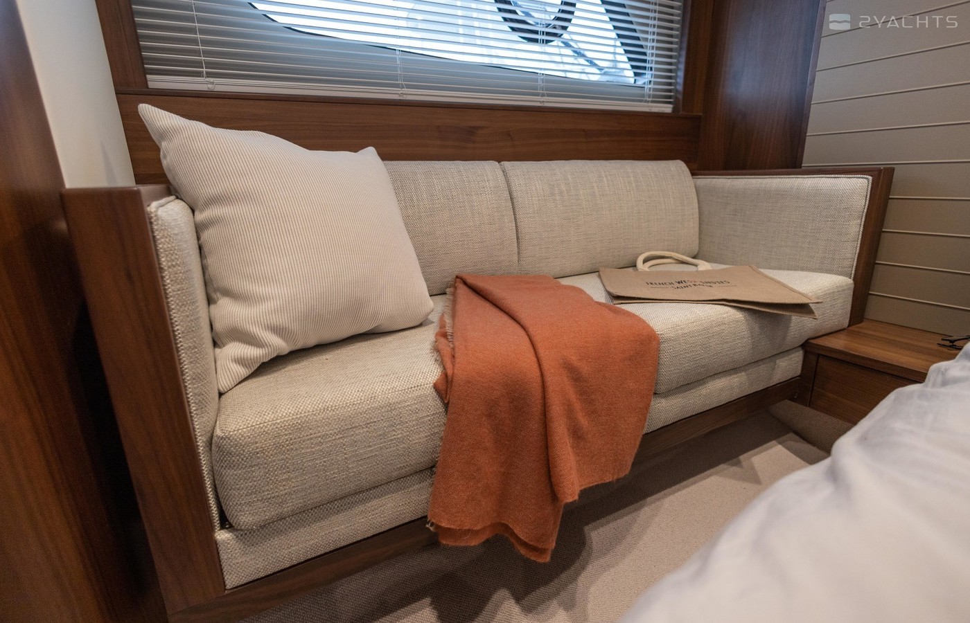 Twin Volvo IPS 600 435hp diesel engines • Volvo joystick control • White hull • Walnut interior woodwork, satin finish • Ice crystal white galley worktop • Raymarine e165 chart plotter and GPS • Raymarine p70r autopilot and rate gyro • Bow thruster • Onan 11kW diesel generator • Reverse cycle air-conditioning • Holding tank • Teak laid cockpit, foredeck and side decks • Cockpit wetbar with sink, electric BBQ and storage • Electro-hydraulic bathing platform • Cockpit sun awning