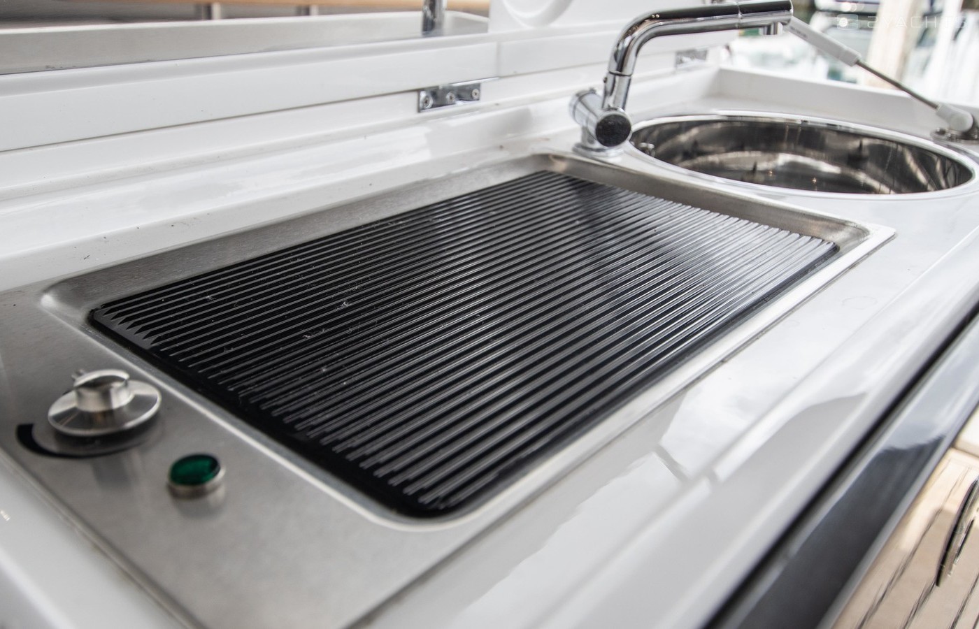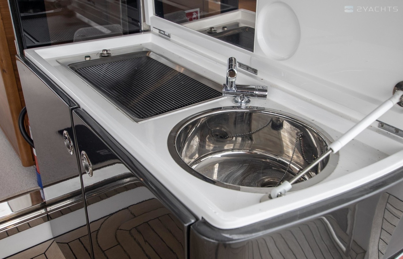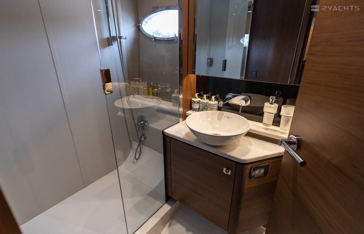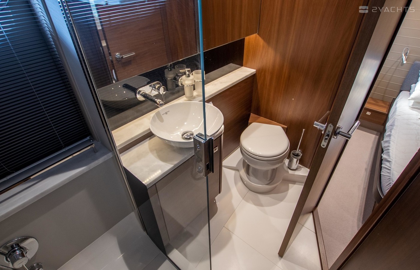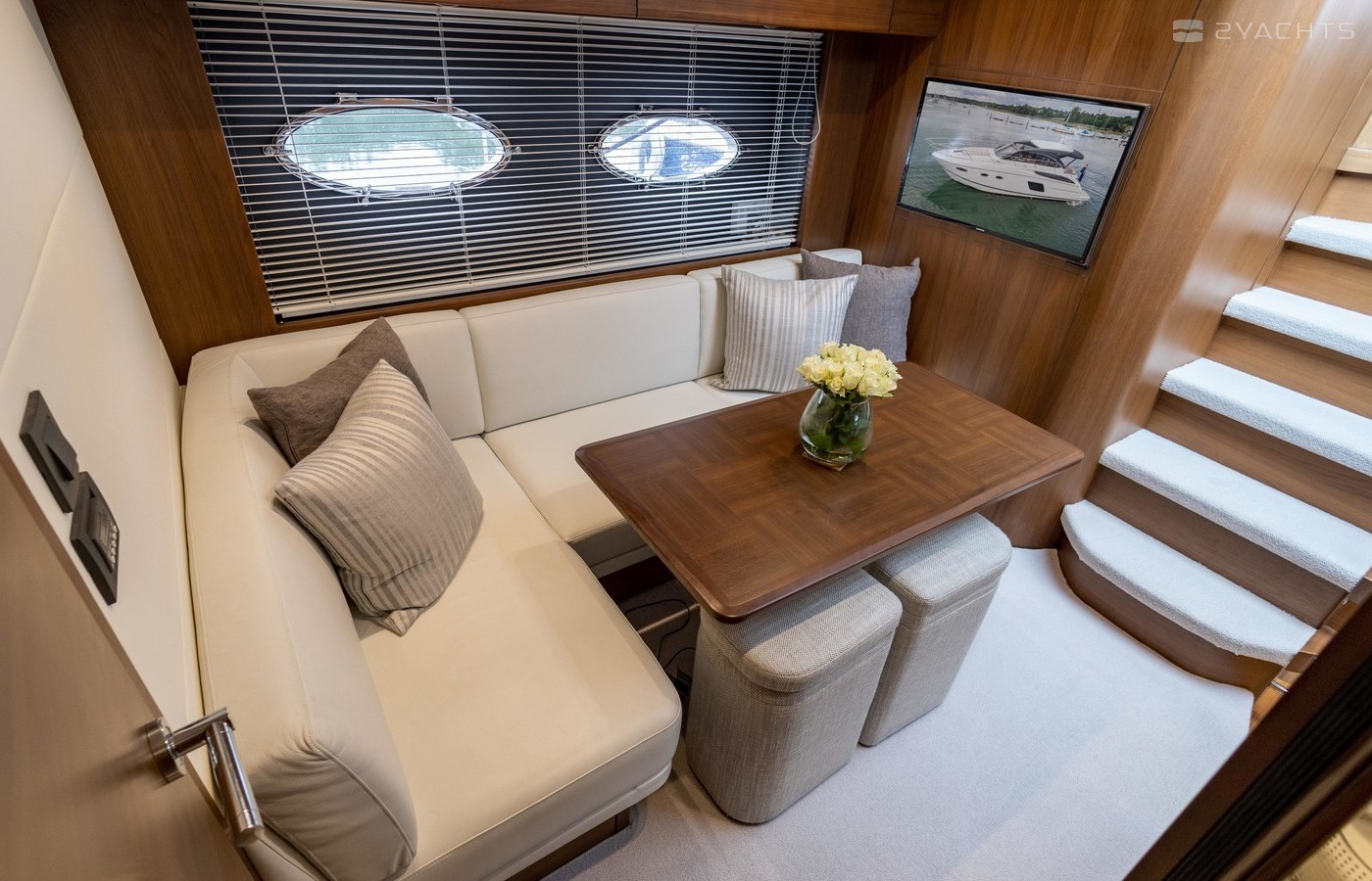Twin Volvo IPS 600 435hp diesel engines • Volvo joystick control • White hull • Walnut interior woodwork, satin finish • Ice crystal white galley worktop • Raymarine e165 chart plotter and GPS • Raymarine p70r autopilot and rate gyro • Bow thruster • Onan 11kW diesel generator • Reverse cycle air-conditioning • Holding tank • Teak laid cockpit, foredeck and side decks • Cockpit wetbar with sink, electric BBQ and storage • Electro-hydraulic bathing platform • Cockpit sun awning