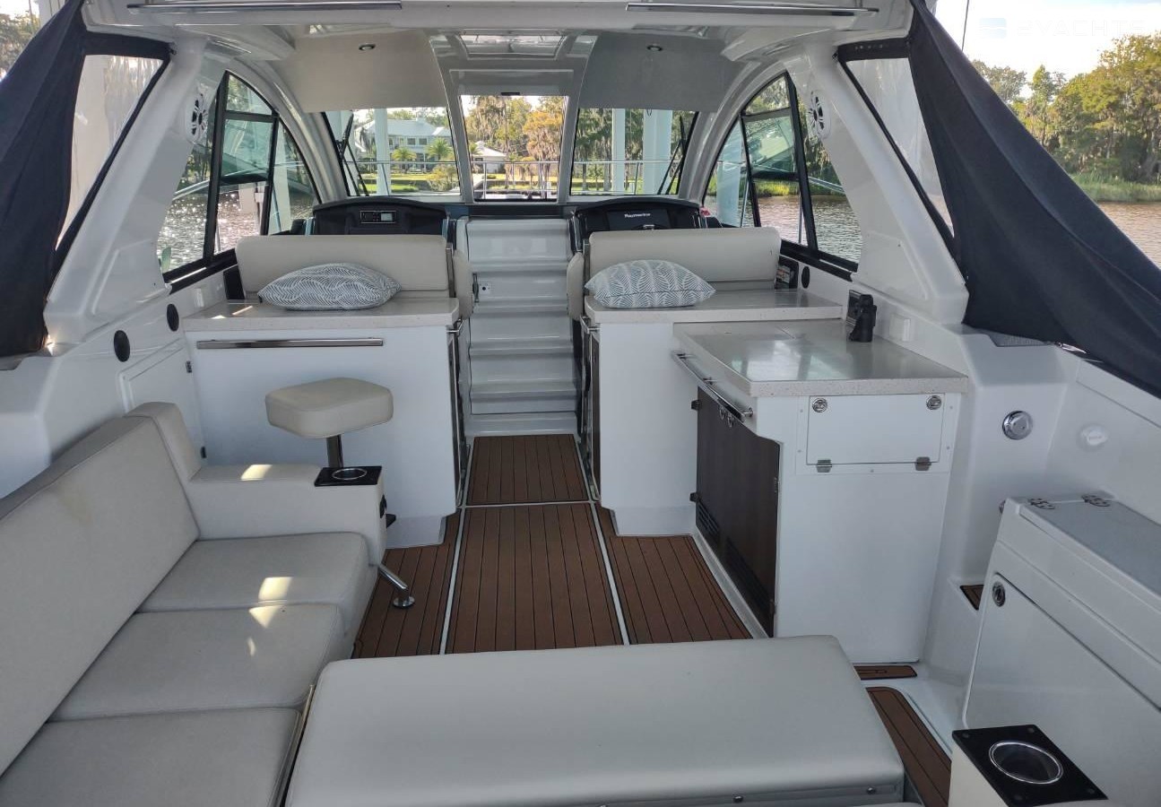 Adorned with cleverly designed seating, unlimited amenities and superior entertainment arrangements, both above and below deck, the 360SC is truly the first of its class. The 360SC Coupe features a masterfully designed helm station with dual electric sliding helm/companion seats, dual wet bars, located both port and starboard, and an open seating area with L-lounge and cockpit table. Below deck a luxuriously appointed cabin awaits you with generous accommodations, featuring a spacious v-berth which converts from a comfortable bed to a dinette and seating area with solid wood table, and fully equipped galley. Beautiful full windows adorn the interior of the cabin allowing you to never miss a moment while underway.