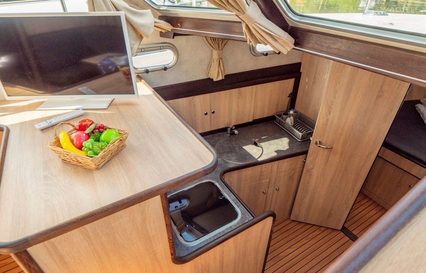 A well-equipped galley with cooker, sink and kitchen utensils is prepared to facilitate cooking. There is also a microwave on board.