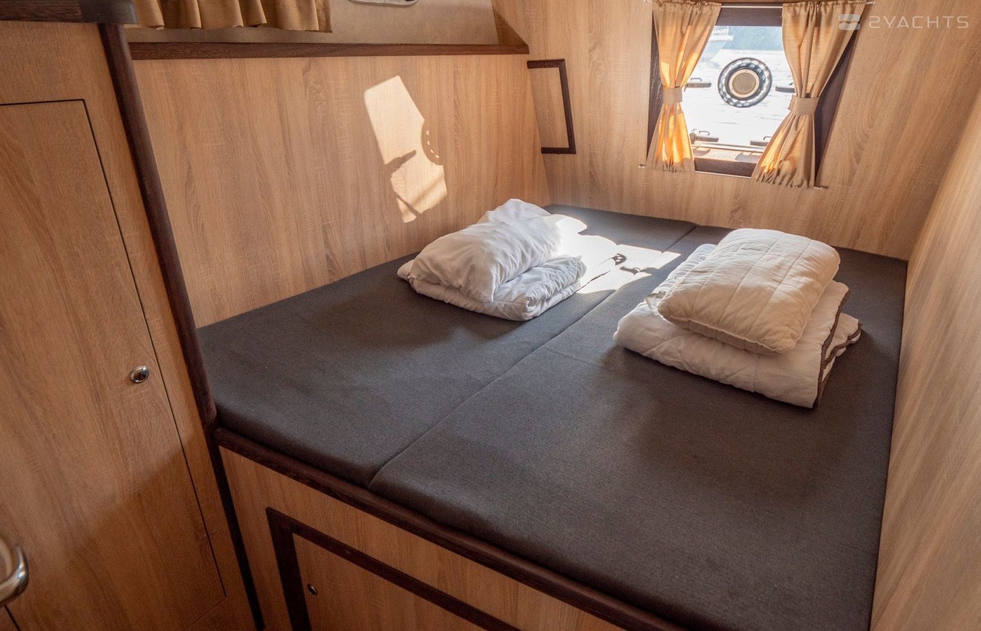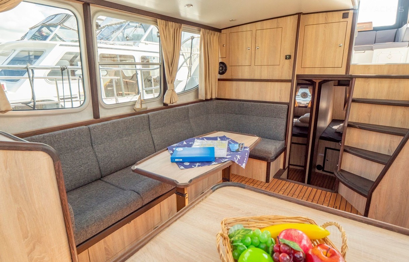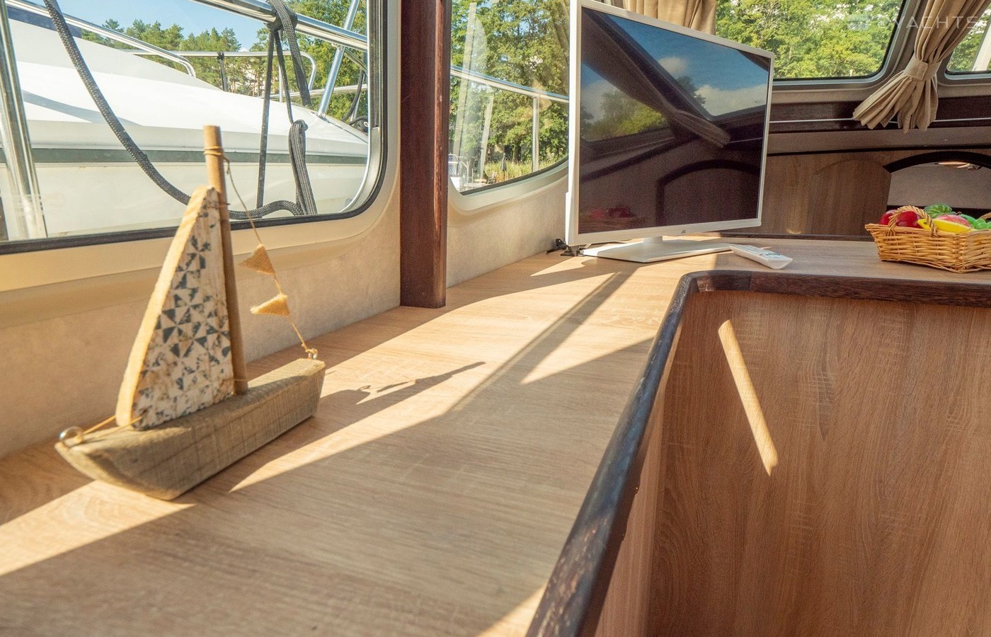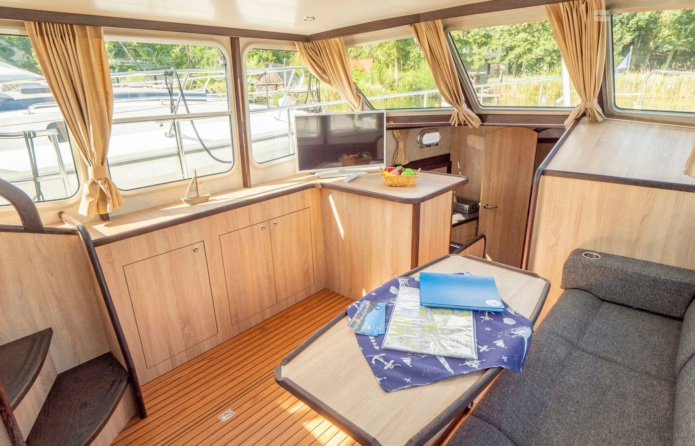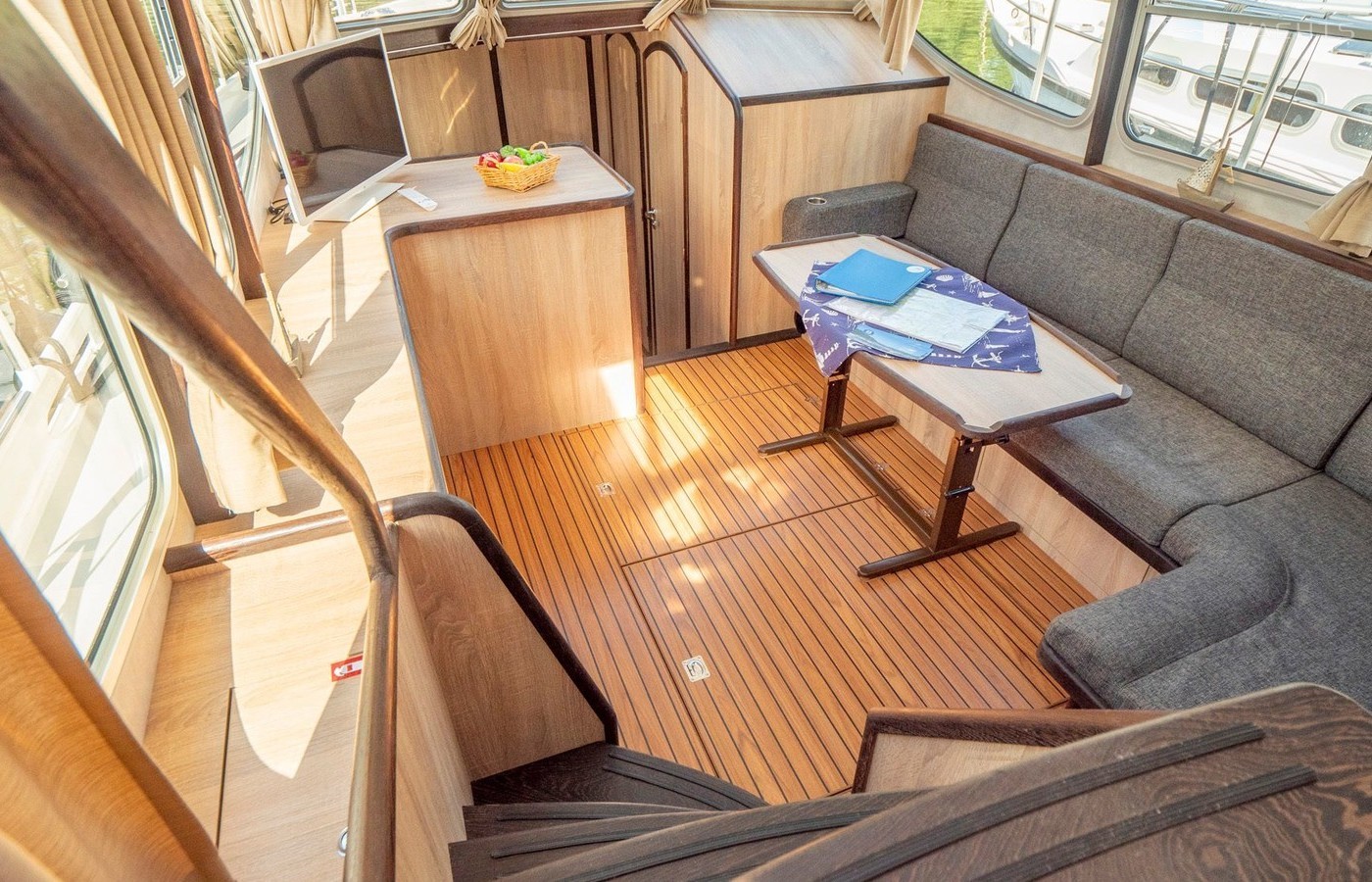 This houseboat is equipped with bimini and bow thruster. In chilly weather, guests will benefit from heating. flat screen tv, an audio system and inside speakers are also available.