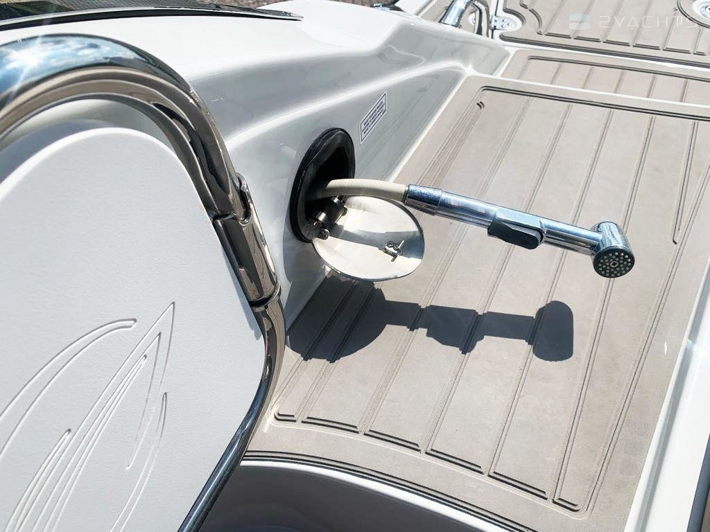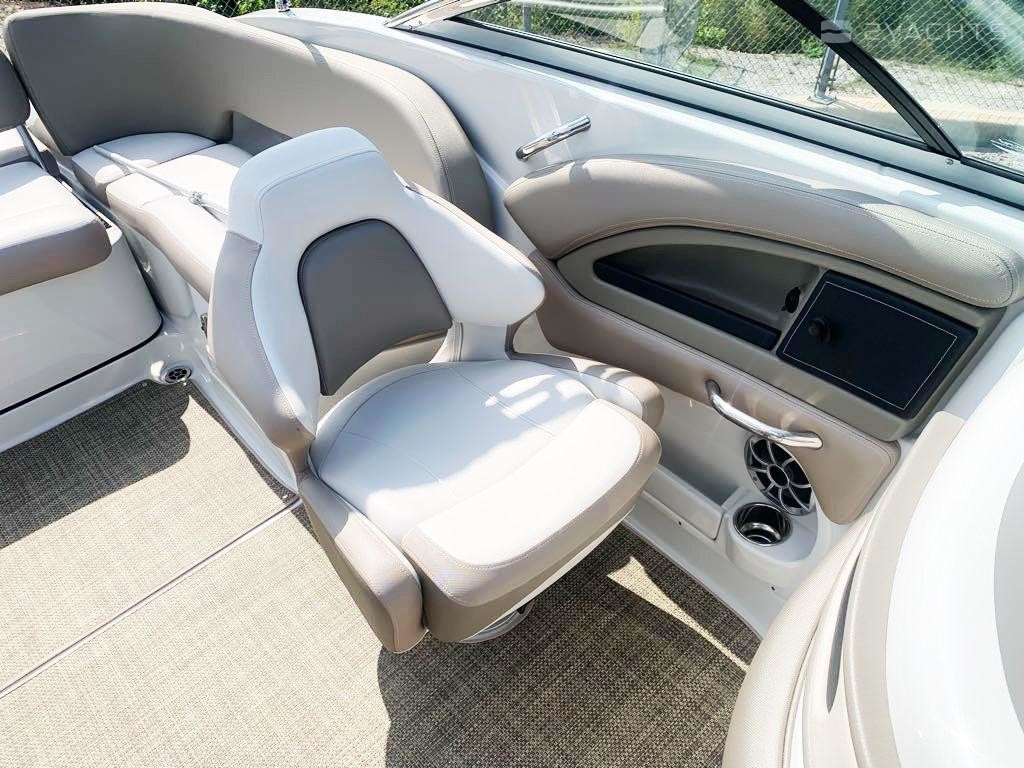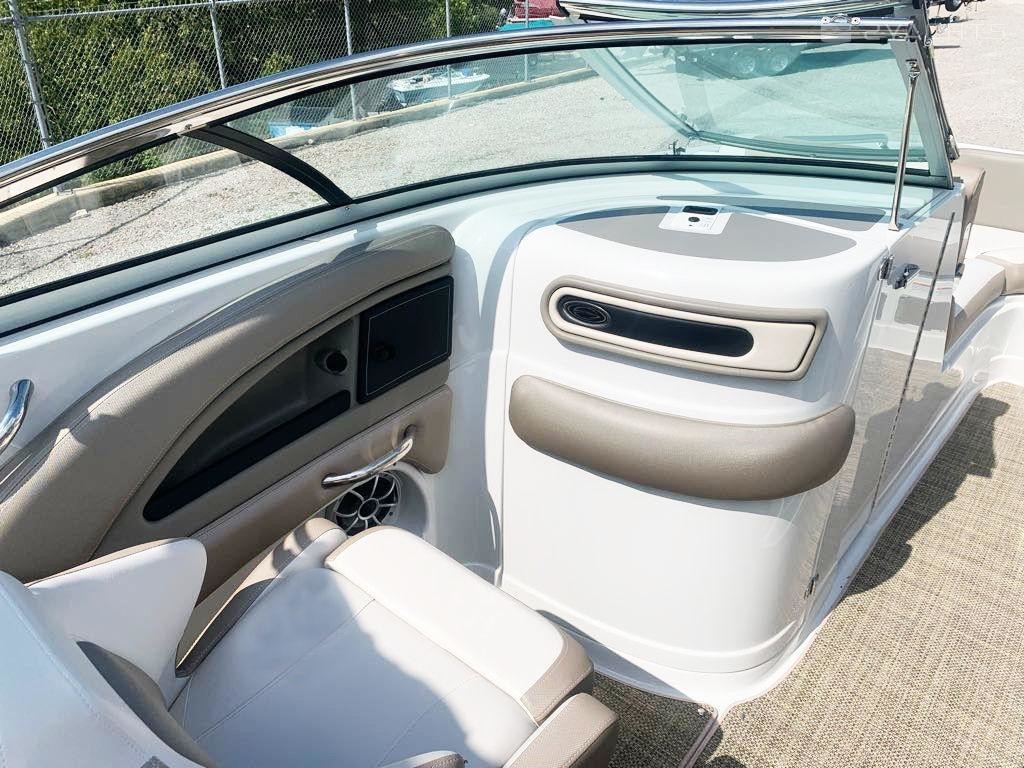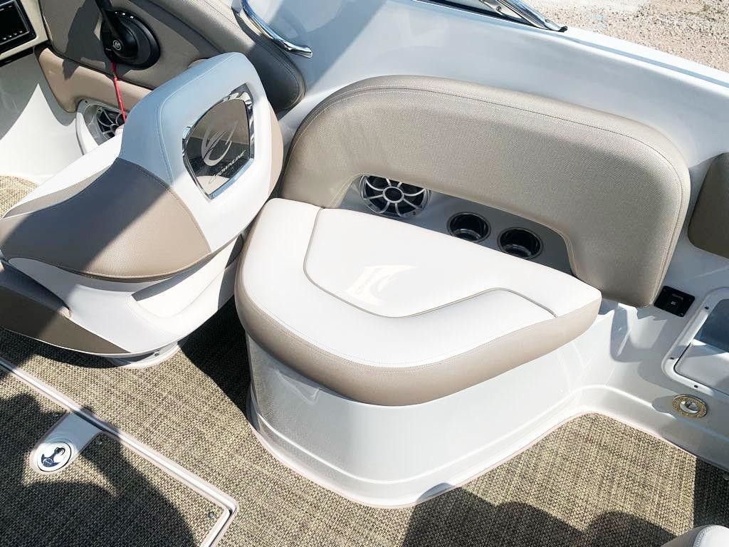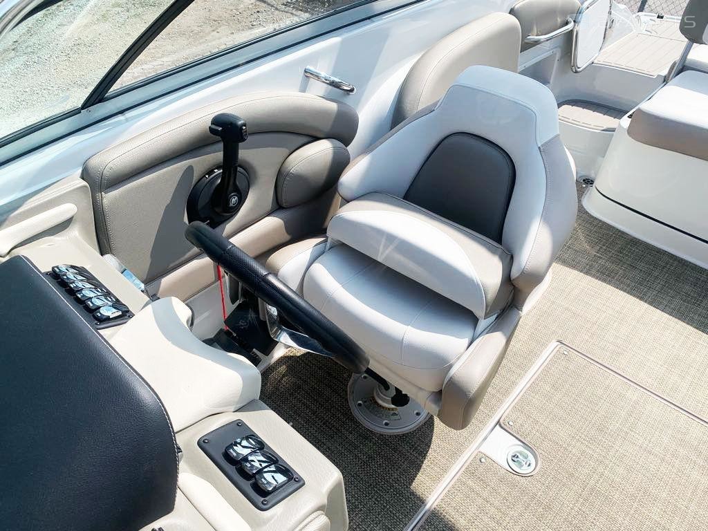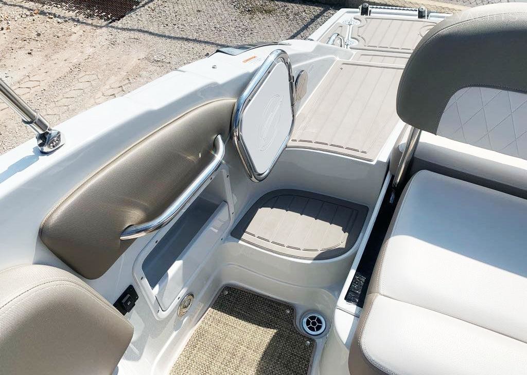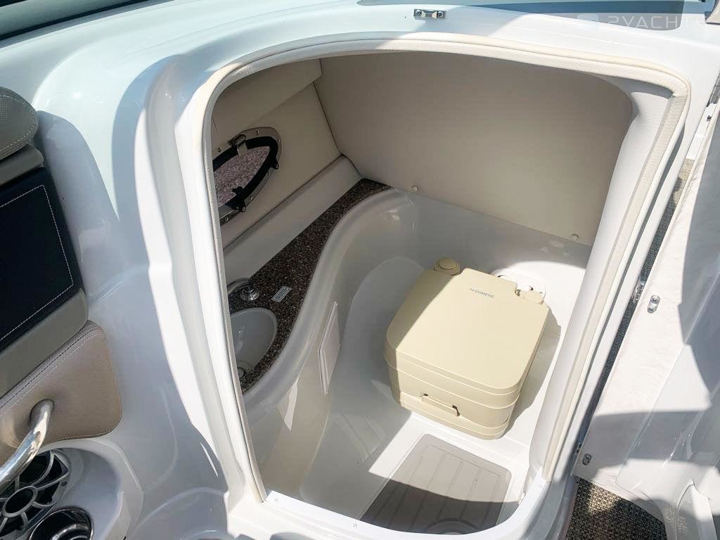 Step inside through the walk thru transom (also notice the soft touch platform mat and handheld transom shower – nice!) and check out the J-Shape cockpit, great fun and conversations will be had here! The pilot and first mate will be comfortable in the dual bucket seats with flip-up bolsters. The aft sun lounge is electric and easily adjusts from sitting up to lying flat – and all positions in between. Snap-in cockpit carpet, LED cockpit lighting and enclosed head compartment with handheld shower, sink with solid surface countertop, opening portlight and porta potti are standard features that will be appreciated by all.