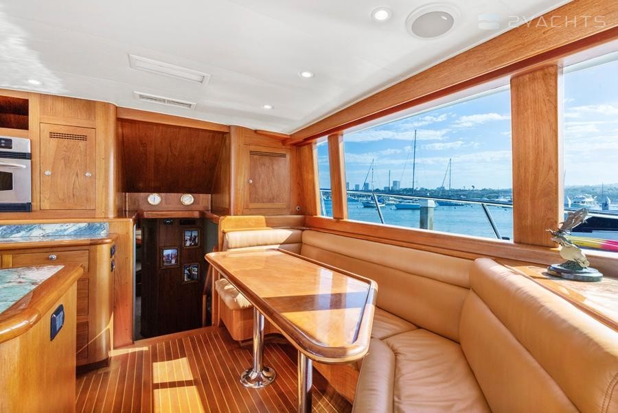 The beautifully varnished teak door opens to a fully remodeled salon and galley. The large windows provide an abundance of natural light especially from the oversized aft window which was custom built and designed. To the starboard is a flat screen TV with surround sound. A large custom-built couch is to the port with integrated storage and an ottoman. A wine cooler and icemaker are located beneath the entertainment center. Moving forward, to the port is the spacious galley with all modern appliances, drawer refers, and custom teak cabinetry. Across from the galley is a large dinette and custom table with seating for six people. Continuing forward, a set of spacious upper and lower bunks for two guests are featured to the starboard. A hanging locker and cabinets provide plenty of storage for the guests as well as rod storage for 16 fishing rods.