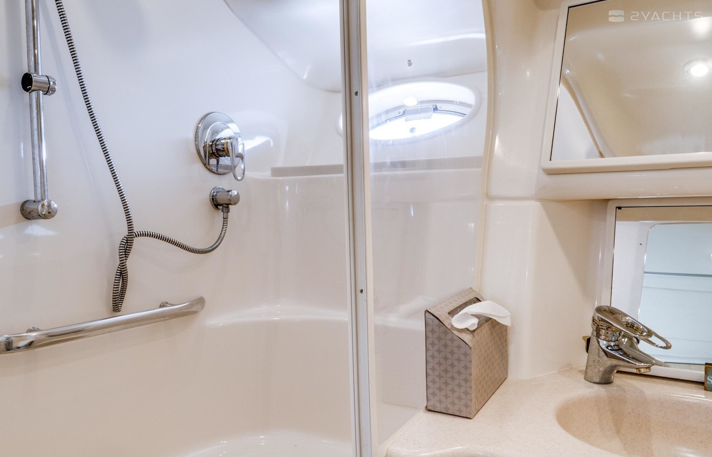 The large Guest Head features separate shower stall with circular acrylic door, seating and adjustable spa shower head.