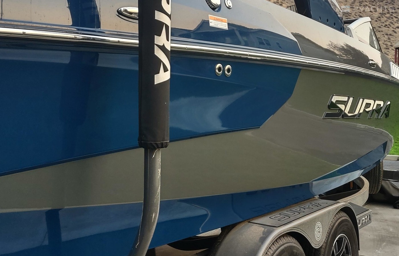 Boat is stacked with all the Supra amenities and Swell Surf components. It's immaculate, serviced annually and winterized. Sealed and stored seasonally. The sound system is epic. The leather is in perfect shape (no fade, no cuts, no wear). The hull is flawless and scratch free. The floor is in perfect shape (not carpet but grippy, firm durable rubberized material). All gauges in perfect shape. Cool lighting system behind speakers, at base of interior floor and on the hull for a night glow. All the redundancies pertaining to the Swell System and other operating systems are in perfect order. The bags are upgraded for the serious surfer. The trailer is in perfect shape as is it's cool "glow" light system.
