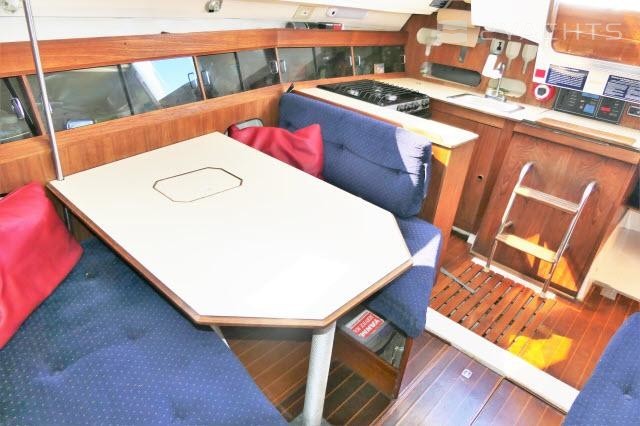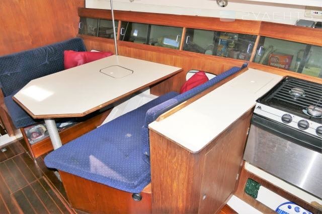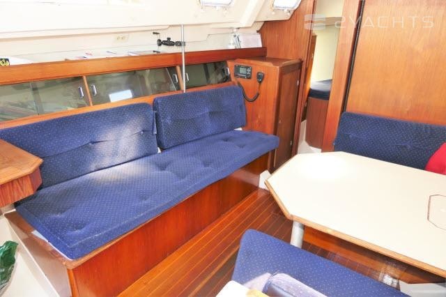 The main salon features a large dinette to starboard and a settee/berth to port. There is ample storage outboard on both sides.
