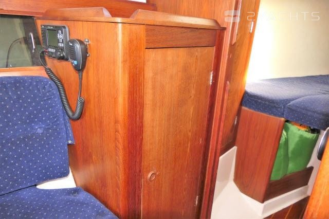 A U-shaped galley is to starboard of the companionway while to port is a forward-facing nav table, hanging locker and the entrance to the aft quarterberth.
