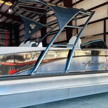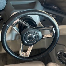 The Versatile Rear Bench Windshield floor plan feature both a port and starboard bow bench. The aft features a corner seating area and a rear facing bench. The seat back can move back and forth so the occupants can face either towards the bow of the boat or the aft (the VRB seat back is electric on this model). In addition to the starboard fiberglass helmstand and chair, the port side has a fiberglass console and midbench. The windshield spans across the port console and starboard helmstand with a gate in between them.