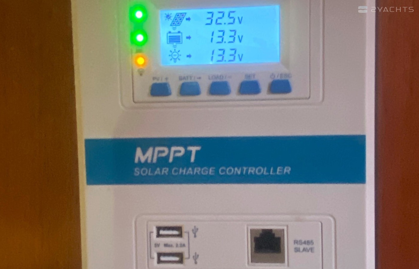 The electrical system is logical and well laid out through the central panel at the navigation station. Each lead bearing a number tab, making it easy to trace shorts and add new electrical features. 400 Ah of Lithium batteries and two solar panels, totaling 650W were installed in January 2022. In addition to the alternator, there is an DuoGen, that can be used to produce electricity from water or wind. We have never had to run the alternator in order to charge the batteries. A Victron Argo FET battery isolator was also installed so both house bank and the starter battery can be charged from the alternator without discharging each other. A new shore power charger weas installed in 2022, and have been used once in a marina, when the solar panels were folded in. Multiple USB-outlets and fans have been installed. There is one 300W inverter to run 220V appliances or small power tools off the battery bank.