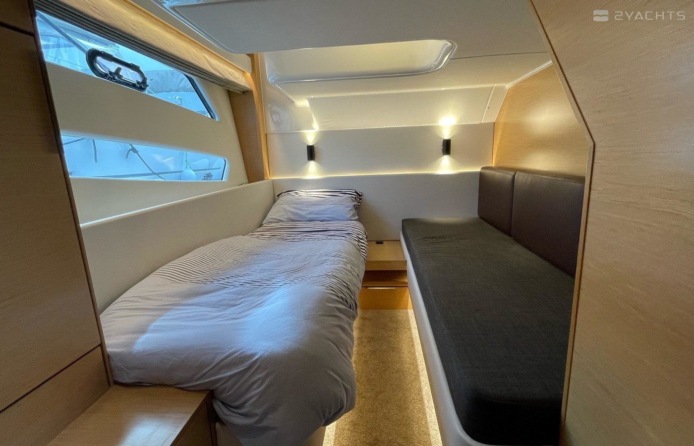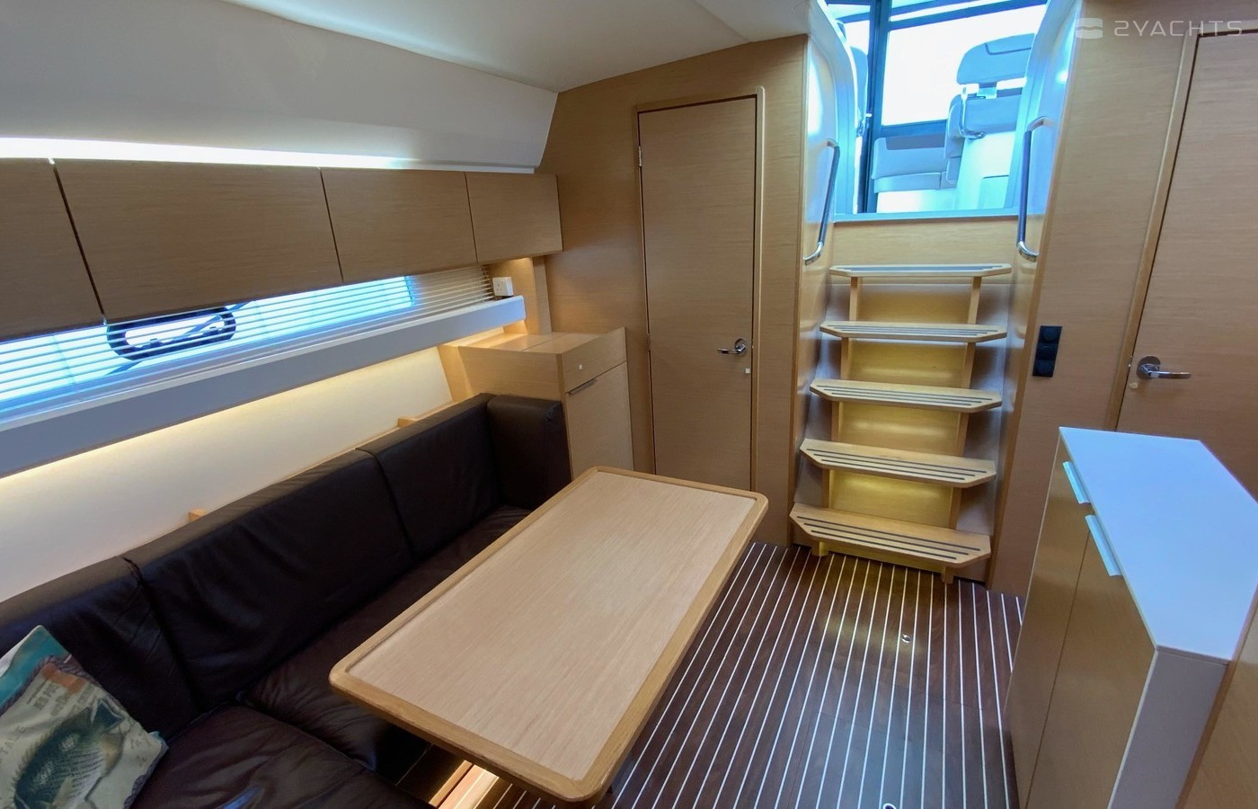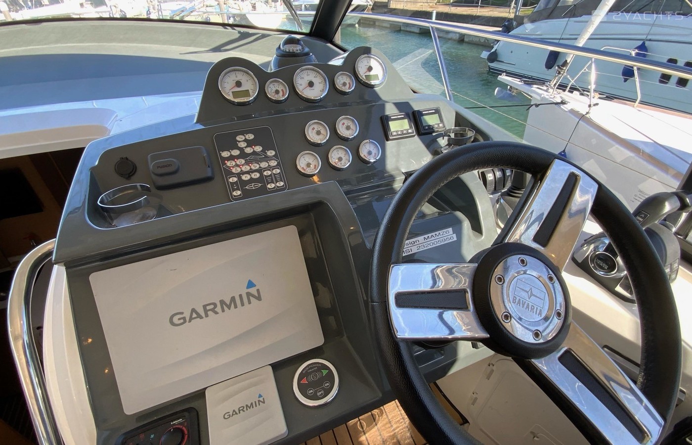 Cabins• Island berth in foreship• Two twin berths, convertible into a double berth• Ocean line flooringSaloon• Upgraded, dark brown leather upholstery• Oak interior woodwork• Reading lamp• LED roof lamps• Covered panel ceiling• Settee in saloon• Saloon table in solid wood• Blinds and fly screen on hatches• Blinds in head• Webasto heating systems• Ocean line flooringGalley• Ceramic stove top• Double stainless steel sink with cover• Twin hob• Free standing microwave in cupboard• Waeco 110ltr fridge• Waeco 30ltr fridge drawer• Waeco 40ltr chest freezerAnchor• Stainless steel delta anchor and chain• Electrical windlassStowage space• Stowage space under the aft sun pad is large enough for a folded RIB• Multiple lockers and wardrobes, including a large space under the forward cab-in bed• Locker and racks• Stowage space under sitting areaSystems• CE-fire extinguishing system• 6 fire extinguishers• Fusion audio system throughout the vessel, controls/speakers in the cockpit, saloon and main cabin• Subwoofer on rear wall of engine room• Mounted 22inch TV’s in saloon and cabin 2• 6.5kW Fisher Panda generator• Mastervolt InverterNavigation• Navigation lights (BSH certification)• Sumlog-sonar, Bidata• Acoustic signal system (BSH certification)• Garmin chart plotter / GPS map 7412• Garmin Autopilot GHP10• Garmin 4kW Radar• Garmin VHF 300i AIS