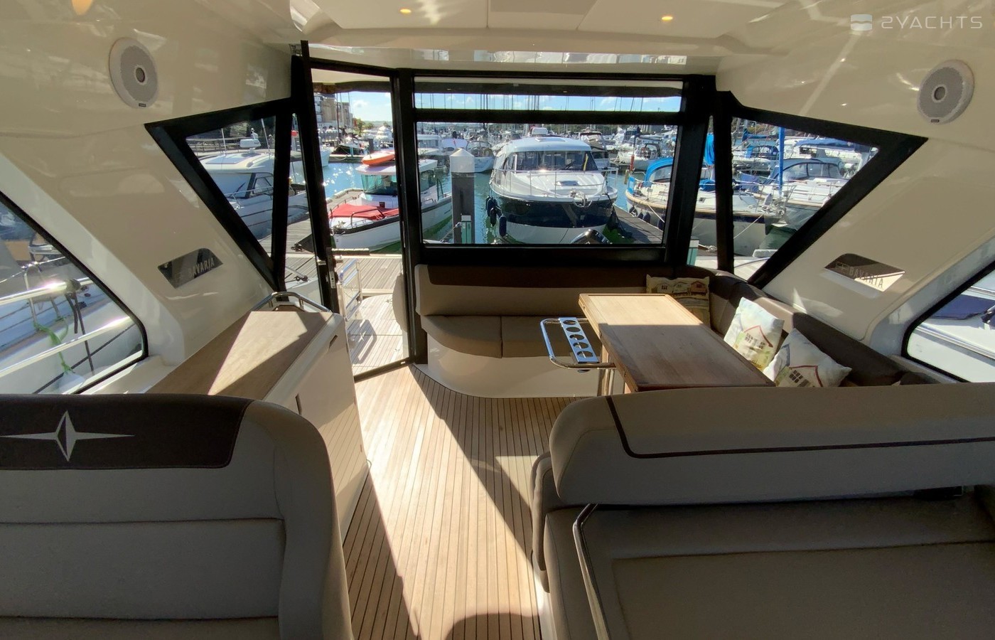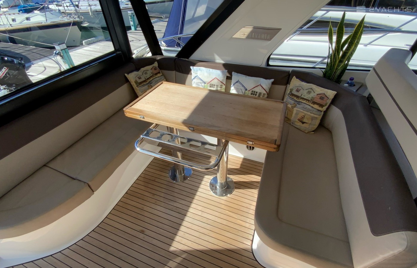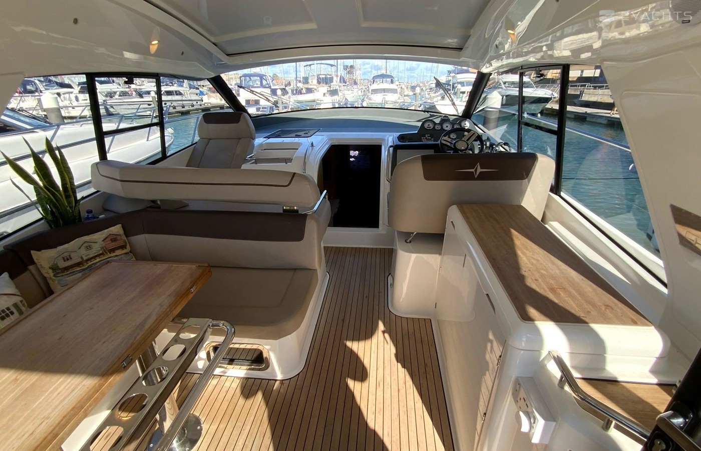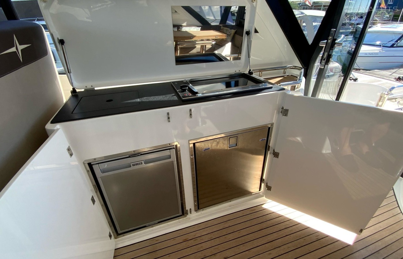 Cockpit• Wetbar including Isotherm 55ltr drawer freezer, Waeco 50ltr fridge and BBQ grill• Sink and tap in wetbar• Cockpit, self-drained• Cockpit light integrated• Windscreen wipers with synchronous control• Security glass windscreen• Illuminated compass• Sliding side window, starboard and port• Helmstand with double seat• Co-pilot seat group in the direction of travel with integrated sun lounge• Backrest for co-pilot sun lounge• Table for settee wetbar in solid wood• Settee and sun pad with upholstery• Settee co-pilot and integrates sun pad with upholstery• Bolster for sun lounger in cockpit• Cockpit table