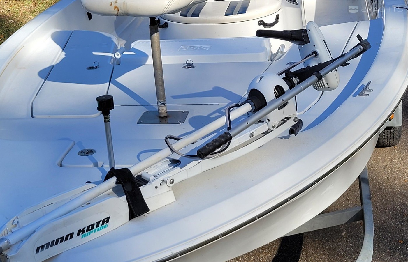 Two manual pole anchors for starboard and port side. Fluke anchor with chain and rope for fore with its own storage hole. Self bailing pump as a backup. Mini Kota drift sock. Six life vests. Orion emergency 4 signal pack with case. Emergency air horn. Three removable seating pads and 3 back rests for pleasure boating. Foward raised casting deck. Dash compass.Fish counter. Spot light.