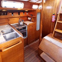 L shaped galley to starboard side of companionway.