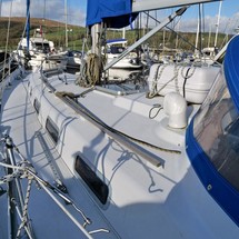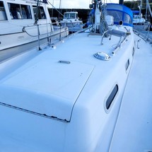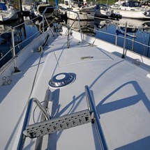 Bridge deck forward with stainless steel grabrails to port and starboard between cockpit and companionway.