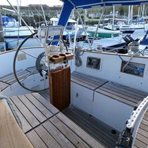 Teak topped cockpit coamings with primary and secondary winches mounted outboard of cockpit.