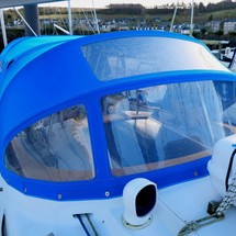 Sprayhood – Blue canvas on stainless steel frame with stainless steel grabrail aft of hood
