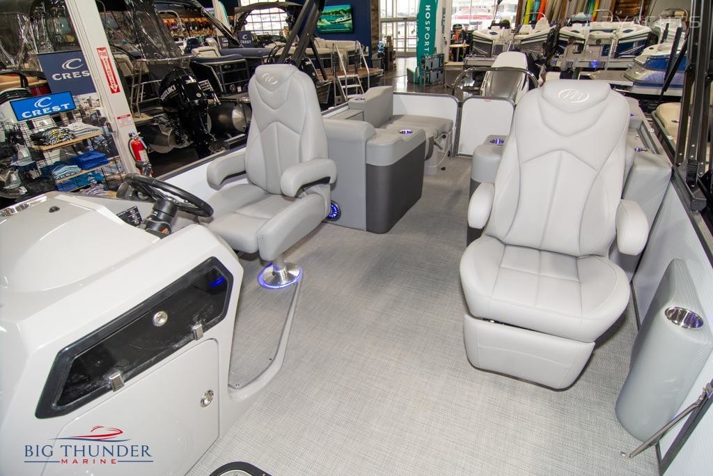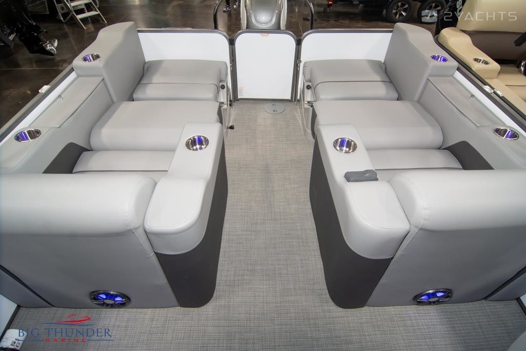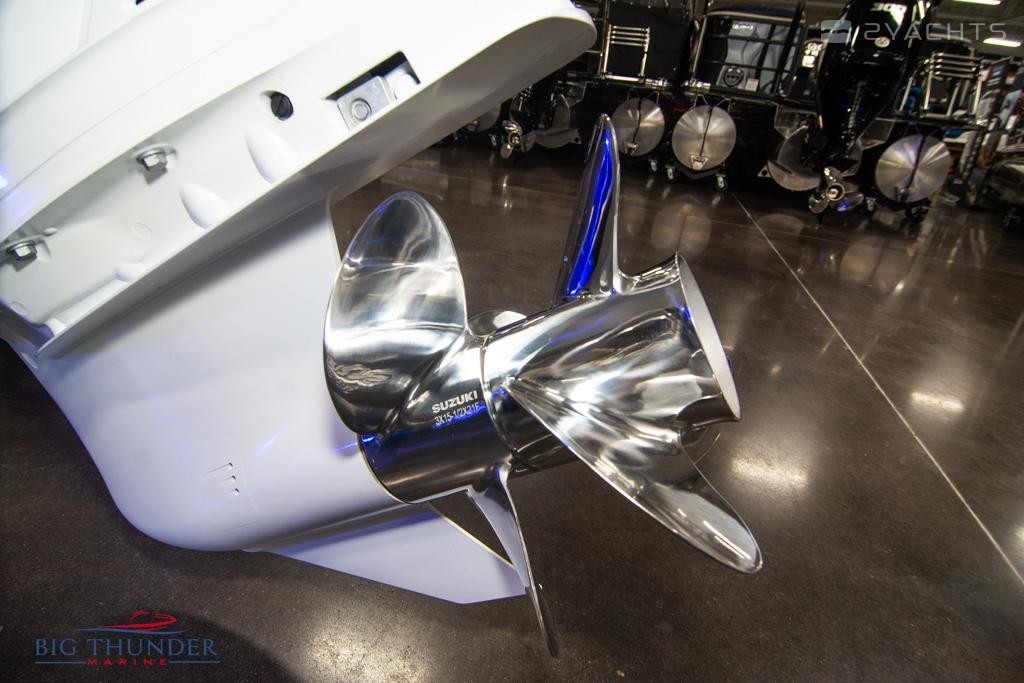 Suzuki SPC Pre-Rig. Suzuki DF300BTXW4 (White). White Metallic Wall Skin w/ Blue Metallic Accent. Antique Silver Powder Coated Rails. Stainless Steel Dockguard, Corner Castings & Gas Cap. Power Arm Bimini w/ Black Anodizing. Silver Woven Luna Flooring. Grey/Neutral Furniture. Premium Pkg. (Garmin 743xs Touchscreen Display, Blue LED Exterior Lights, Blue LED Bimini Lights, Blue LED Cupholder Lights, Blue LED Pedestal & Table Base Lights, Rear Stereo Remote, Dual Battery Smart Switch, High Back Helm Chair). Premium Fusion Stereo Upgrade. Battery Charging Station. Port Aqua Lounger w/ Kickout Footrest. Folding Entertainment Table. Bow Filler Bench. Center In-Tube Storage. (2) Portable Cupholders. Mooring Cover.