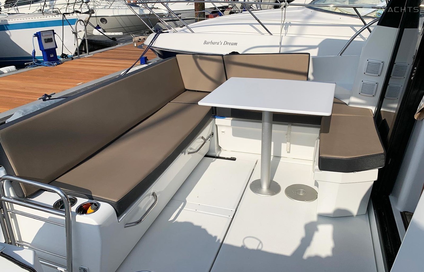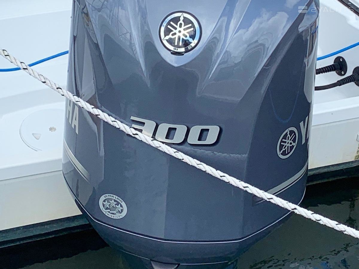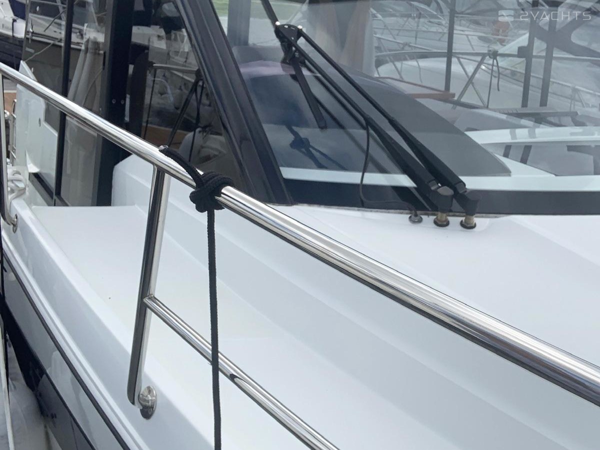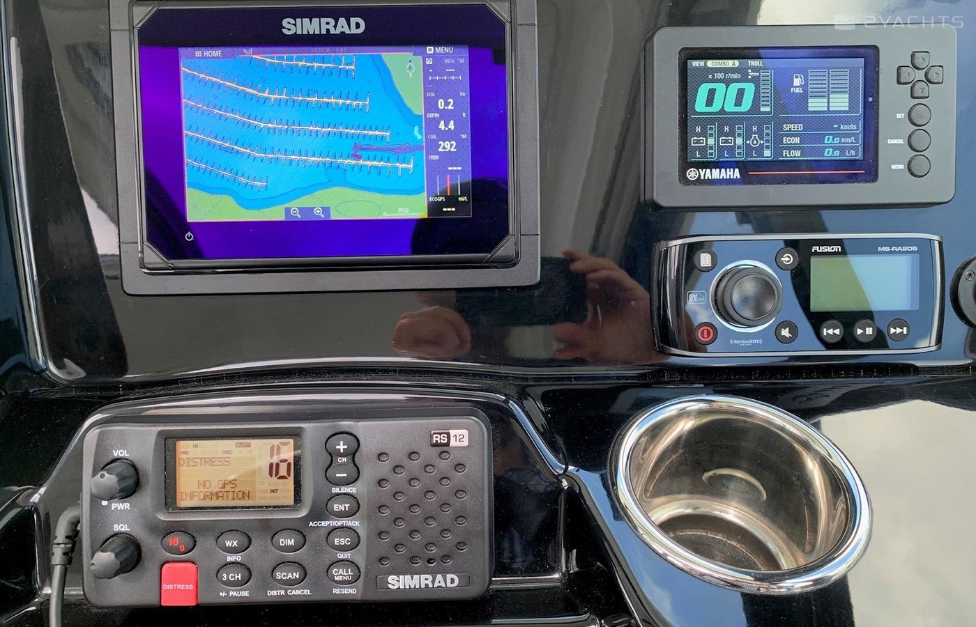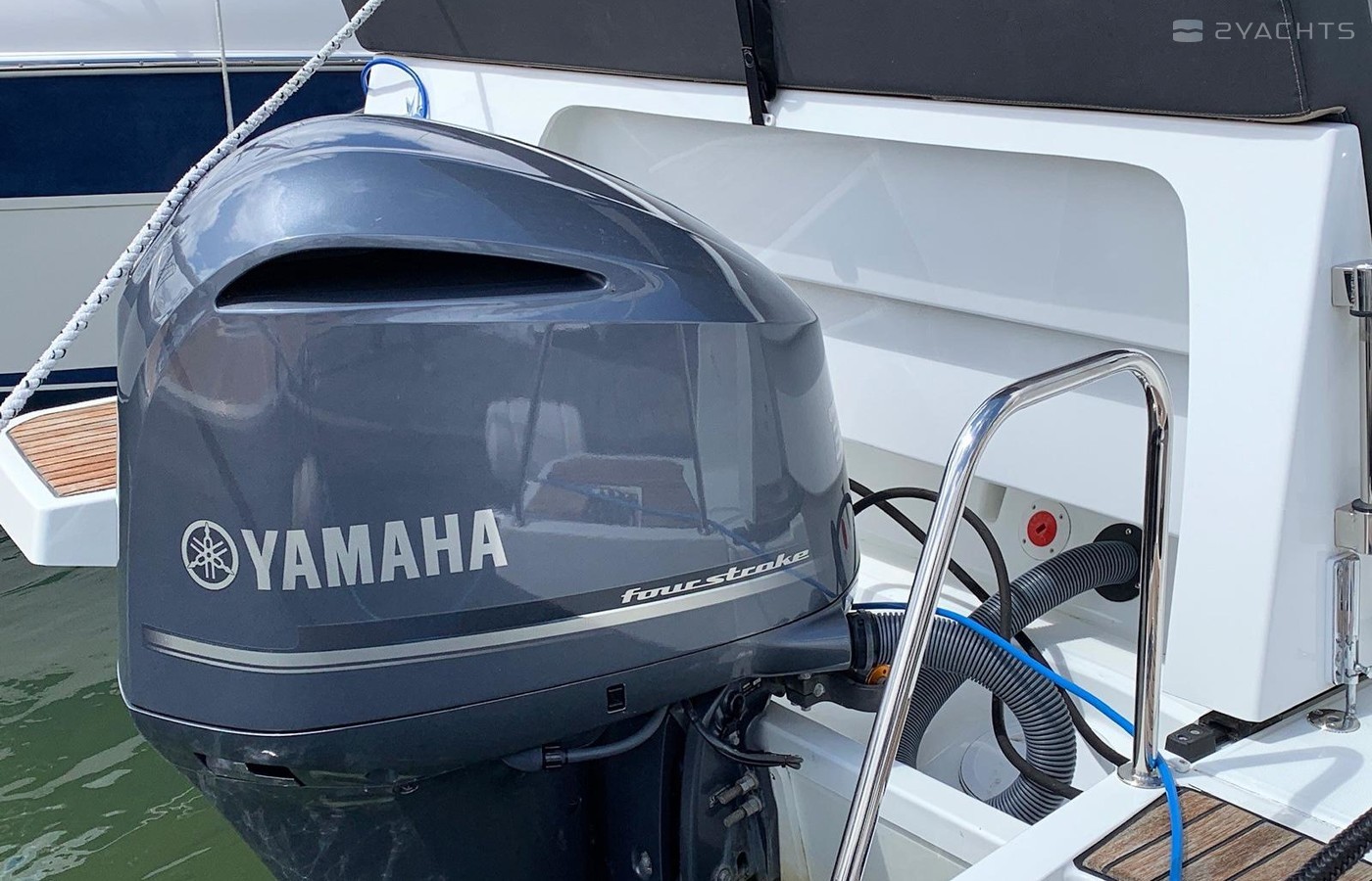 * Single Yamaha F300BETU electronic drive-by-wire engine with approximately 80 hours recorded.* Premiere pack - Electric anchor windlass, aft cockpit bench cushions, 60 litre fridge, cockpit shower, electric trim tabs, LED lights in the wheelhouse and front cabin, LED lights in the cockpit floor, toilet seat and bed surround in the front cabin.* Mooring and anchoring kits.* Comfort pack - Bow thruster, shore power, battery charger and water heater.* U-shaped cockpit saloon.* Twin burner gas hob.* Curtains for the wheelhouse.* Interior carpets.* Microwave.* Electric flush toilet.* Webasto diesel fired warm air heating system.* Rear sun canopy and enclosure.* Simrad GPS chartplotter with sonar transducer.* VHF radio.* Fusion audio system.* Bathing platforms with teak.* Trim tabs