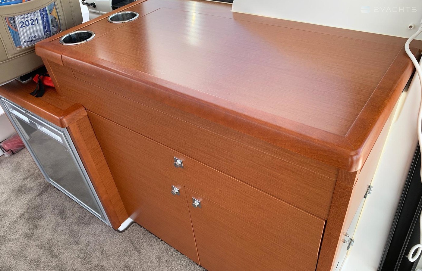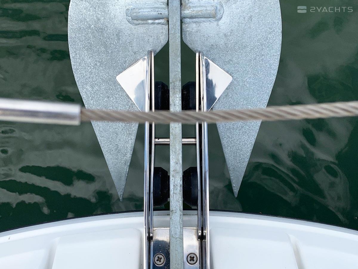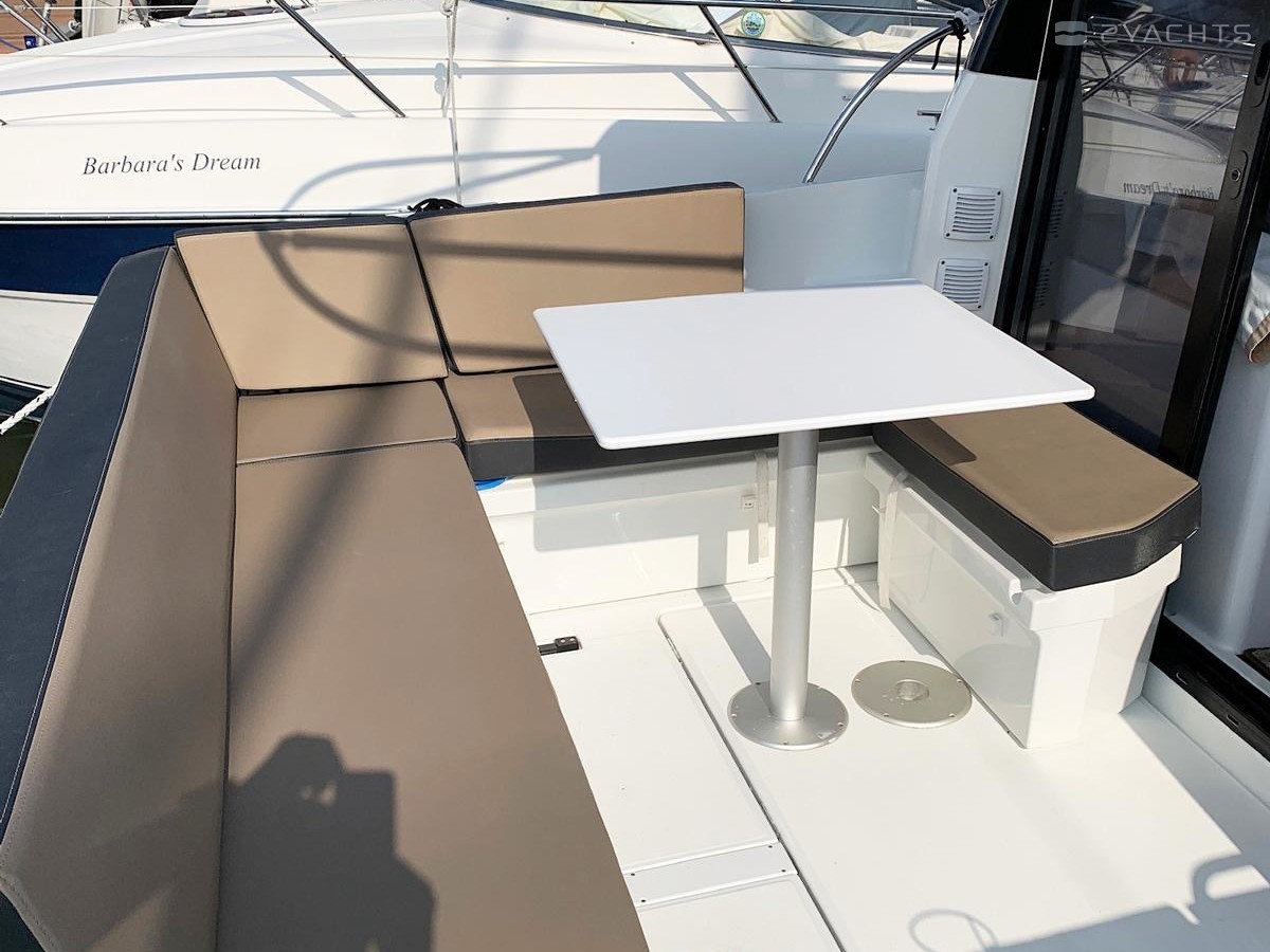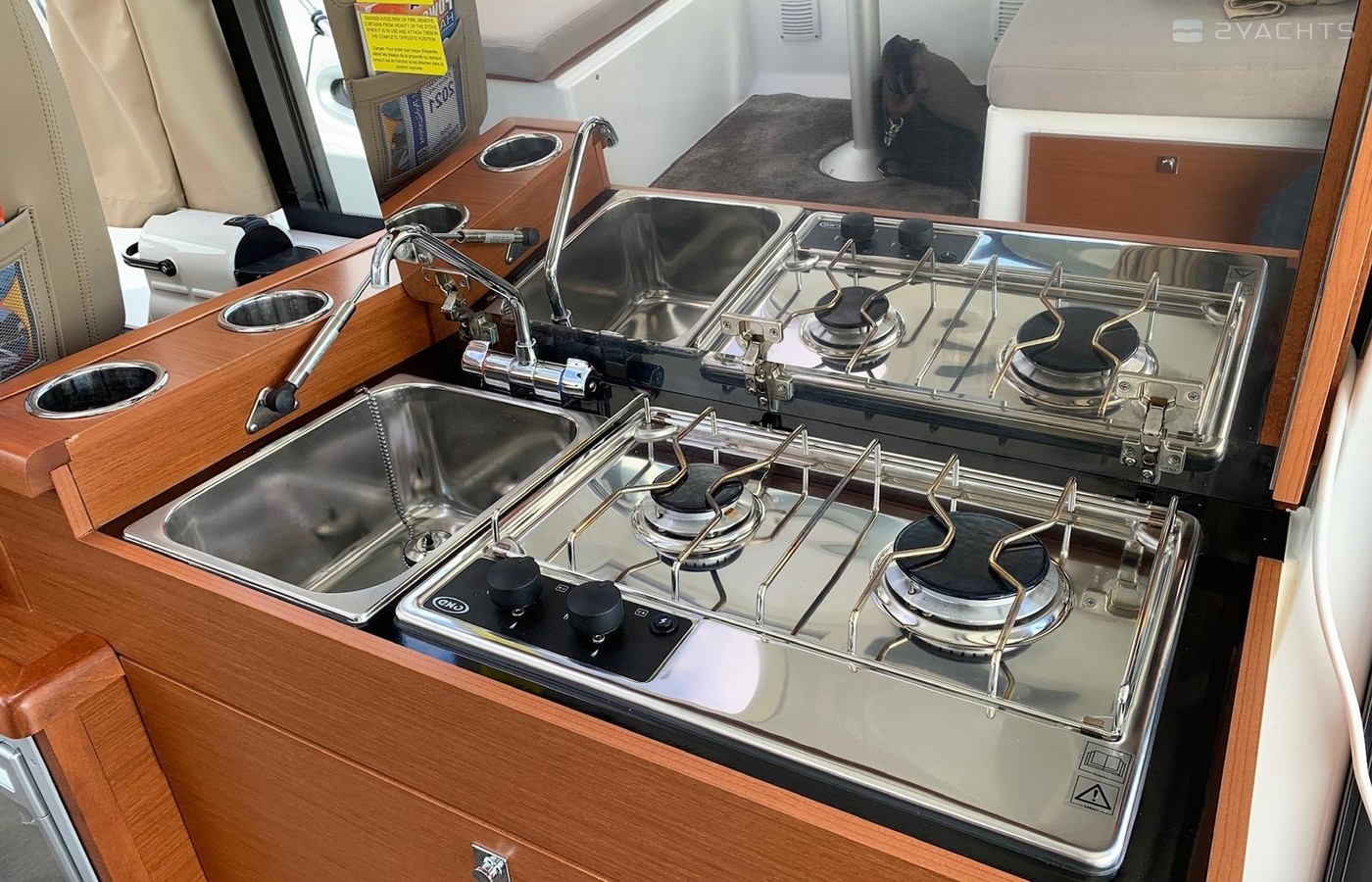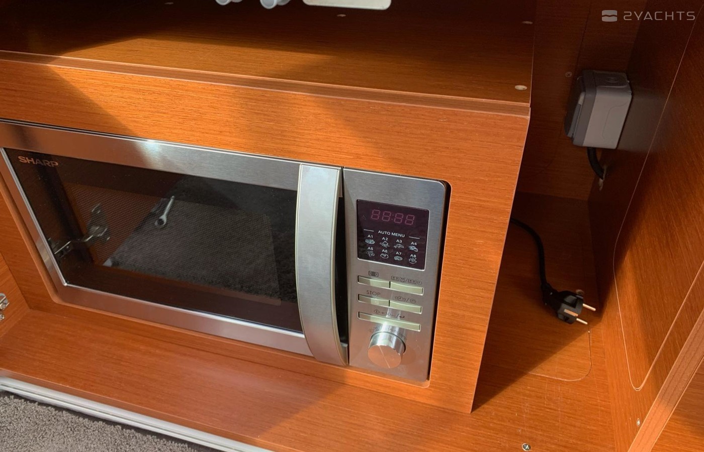 * Single Yamaha F300BETU electronic drive-by-wire engine with approximately 80 hours recorded.* Premiere pack - Electric anchor windlass, aft cockpit bench cushions, 60 litre fridge, cockpit shower, electric trim tabs, LED lights in the wheelhouse and front cabin, LED lights in the cockpit floor, toilet seat and bed surround in the front cabin.* Mooring and anchoring kits.* Comfort pack - Bow thruster, shore power, battery charger and water heater.* U-shaped cockpit saloon.* Twin burner gas hob.* Curtains for the wheelhouse.* Interior carpets.* Microwave.* Electric flush toilet.* Webasto diesel fired warm air heating system.* Rear sun canopy and enclosure.* Simrad GPS chartplotter with sonar transducer.* VHF radio.* Fusion audio system.* Bathing platforms with teak.* Trim tabs