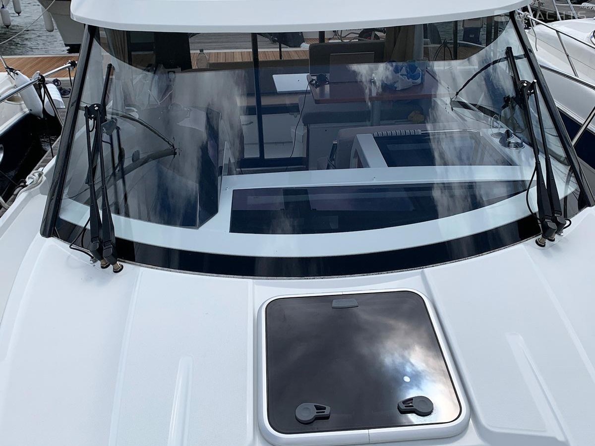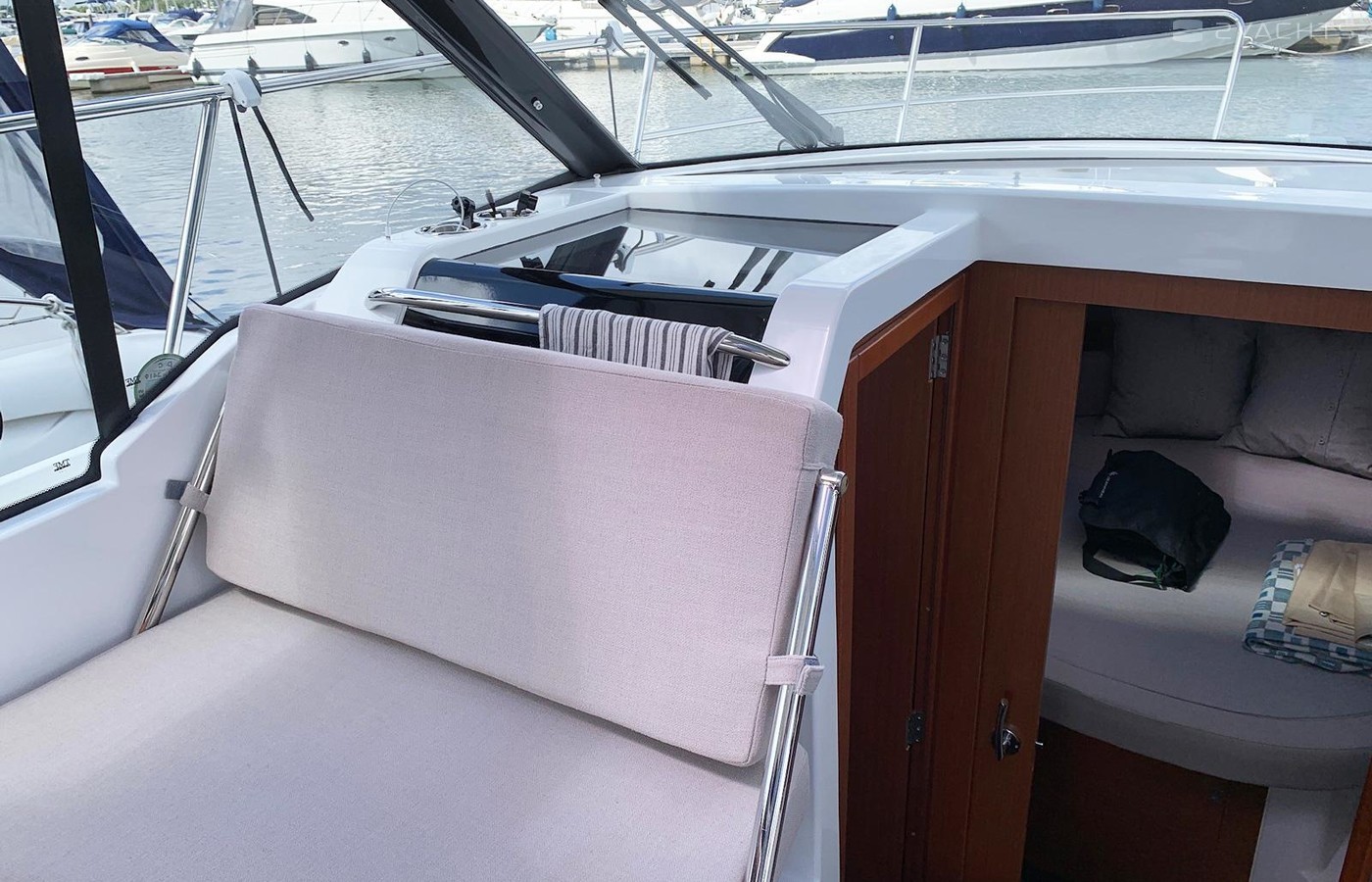 Her remarkably bright interior is due to wide windows in the helm station, affording impressive sea views. In the cabin (separate, fully enclosed), the window is also enlarged to benefit from an exceptional view of the exterior.