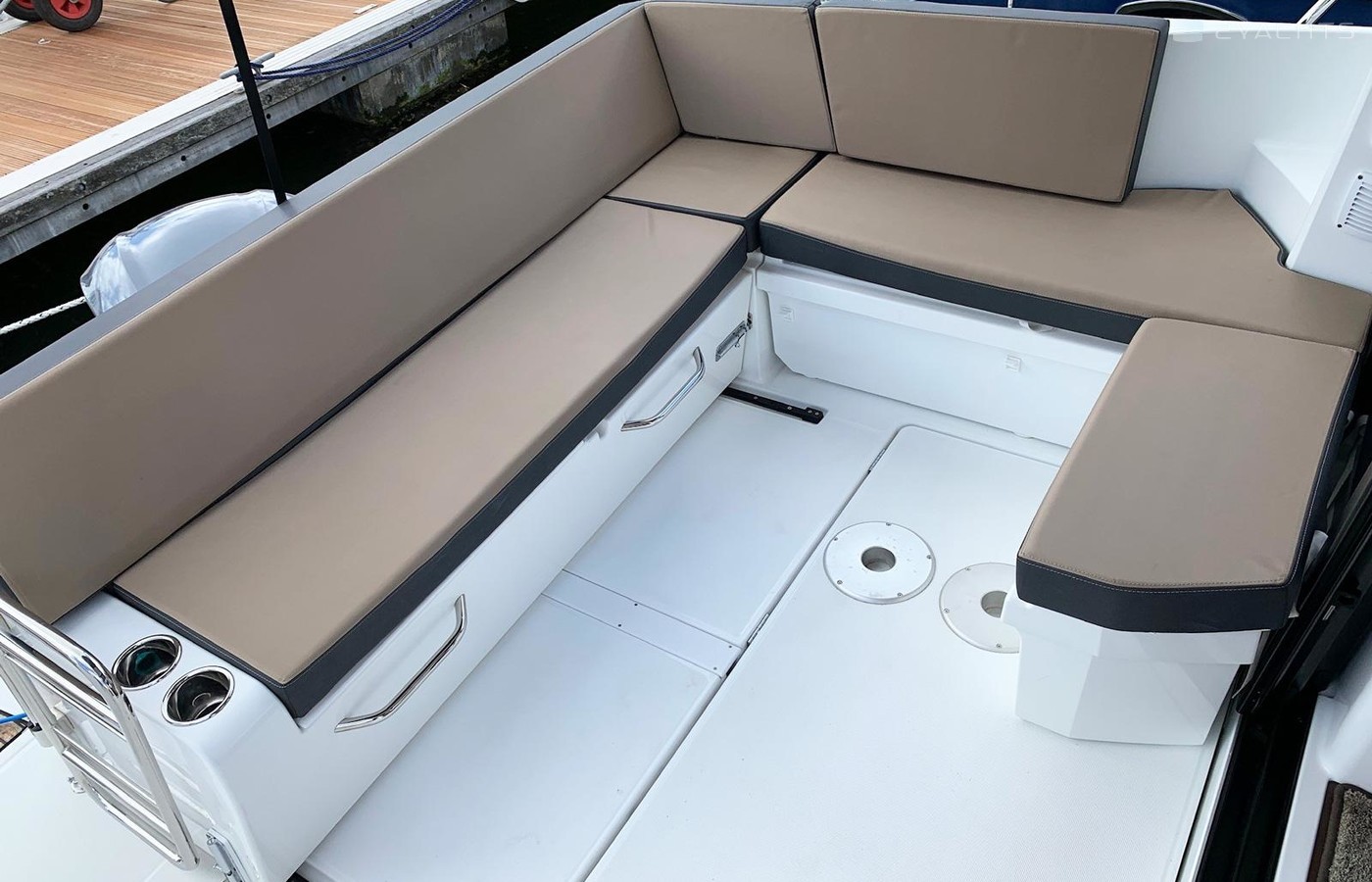 Comfortable design details abound. The cockpit benefits from an U-shaped saloon, reclining seatbacks and cup holders in the armrests.