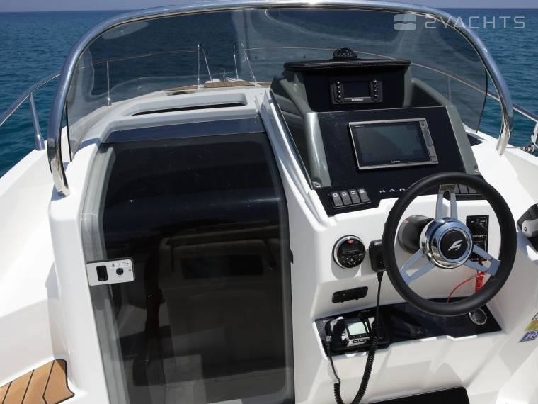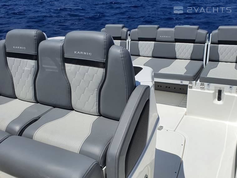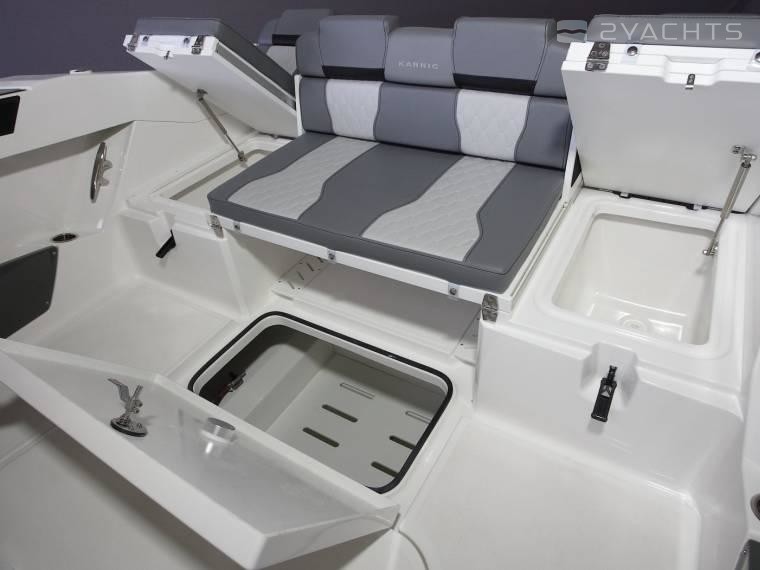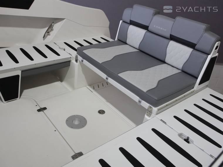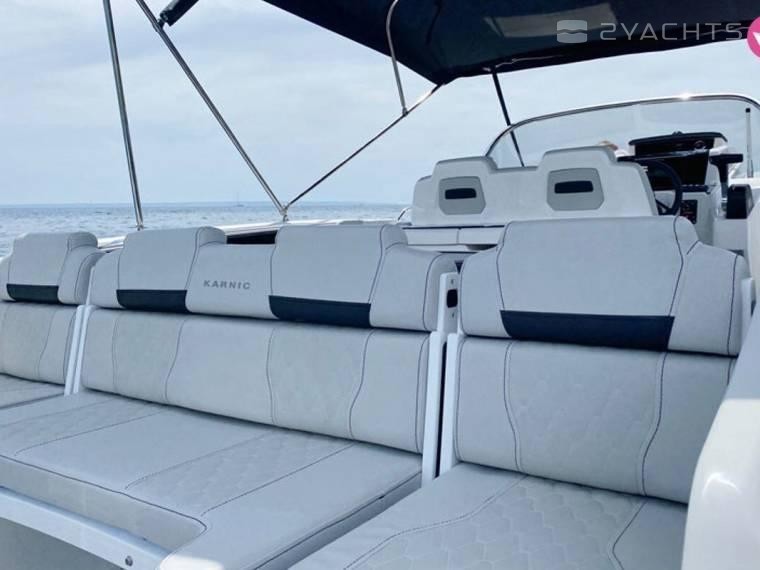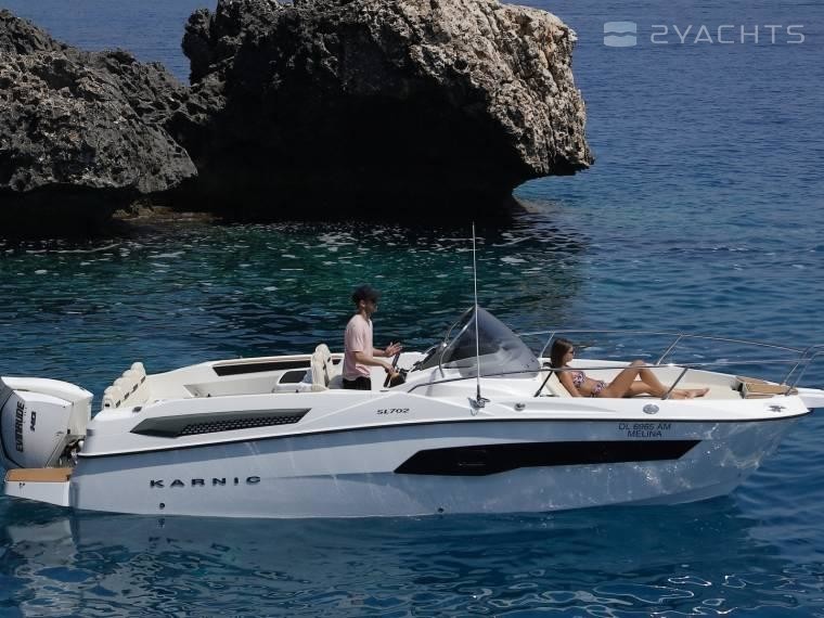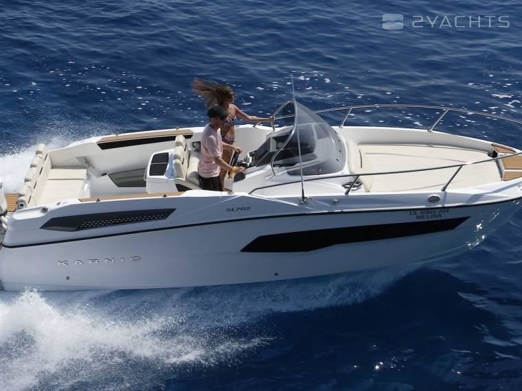 Discover the unparalleled quality and beauty of the best selling sundeck boat from Karnic Powerboats.Offering the best styling, sleek design, outstanding quality and an unbeatable ride in it's category with unique innovative features.The Karnic SL702 offers a unparalleled quality and style, a unique centre cabin/console configuration, elegant styling, excellent performance, foam injected hull and a clever modular-style rear seating and cockpit layout to suit your requirements. 10 Years warranty on hull.Standard Features: All composite foam injected hull structure with osmosis resistant vinylester skin coat, Fully monitored manufacturing process with Injection Technology, Self bailing cockpit with non-skid cockpit and bow floors, Fused electrics package with navigation and illumination lights, marine horn and manual/automatic bilge pump, Anchor roller and concealed recess for optional windlass, Heavy duty, stainless steel, styled cleats at bow and stern, Welded stainless steel rails mounted using casted stainless bases, Walk-through stern with collapsible motor well hatch, Stainless steel deck hardware and hinges, Recessed, weather protected marine grade cockpit speakers at bow and cockpit, Beverage holders at console, sundeck and stern, Styled double curvature console windscreen with oval section stainless grab rail, Marine grade electrical switches, compass, media/receiver, USB and 12V sockets, Stern, under seat drainable wells (2) and sole storage compartment, Cockpit side storage pockets, V-berth cabin accommodation for two adults with ventilation portlights, Real walnut interior wood, Lockable toilet compartment with sink and ventilation portlight, Cabin walnut cabinet with top storage pocket.Standard Accessories Included? LP Weekender Helm Seat? Weekender version with gas stove and sink? Igloo coolbox 51 Litre? Upgraded upholstery? Swim platforms pair with ladder? Marine toilet with holding tank? Bimini top extended version, stainless steel frame? Table? Console and Helm seat cover? Bow deck cushion? Cover, console and helm seats? Cabin starboard and port windows? Karnic Deluxe steering wheel upgrade? Cockpit Led Blue illumination? Stern layout seating converting to sunbed? Electrical anchor winch ? Hydraulic steering ? Sea Dek floor package bow and stern ? Rod Holders