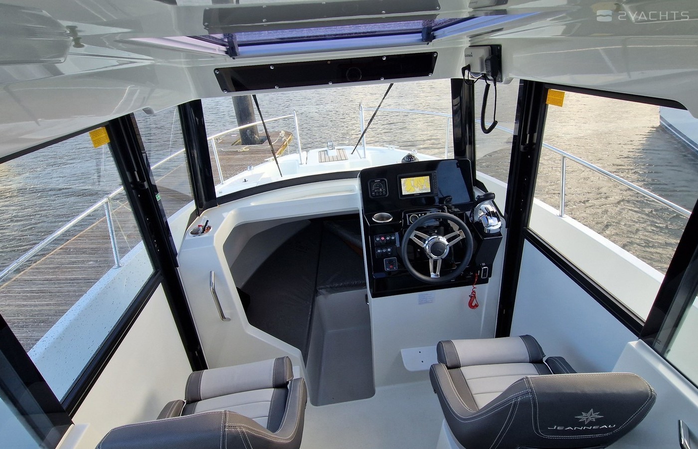 Forward cabin with seating that converts to a double berth with an infill, under seat storage, opening portlight with blind. Heads compartment to starboard, steps up to the wheelhouse with helm station to starboard and sliding door to the starboard side deck. To port, navigators seat and sliding door to port side deck. The helm seat is adjustable and both seats can swivel.Sliding roof hatch with blind. Aft bench seat and aft sliding window to the cockpit. Under the aft bench seat is a sink with pressurised cold water and space for a portable gas stove (not supplied).