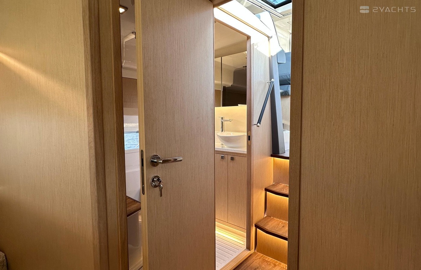 The boat is equipped with optional glass sliding roof and another sliding canvas skylight over the cockpit area.