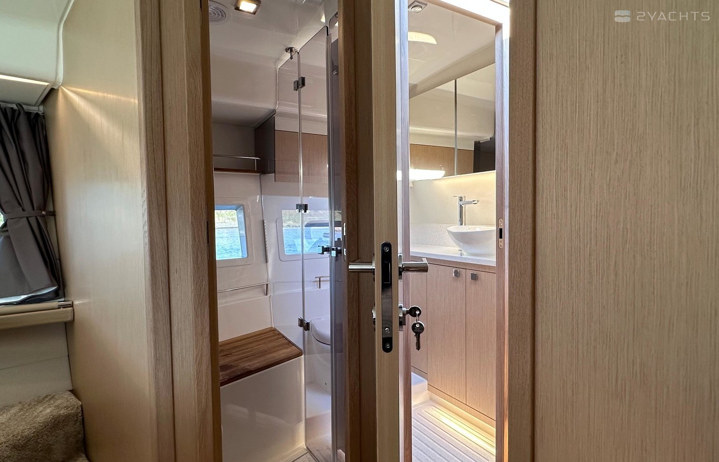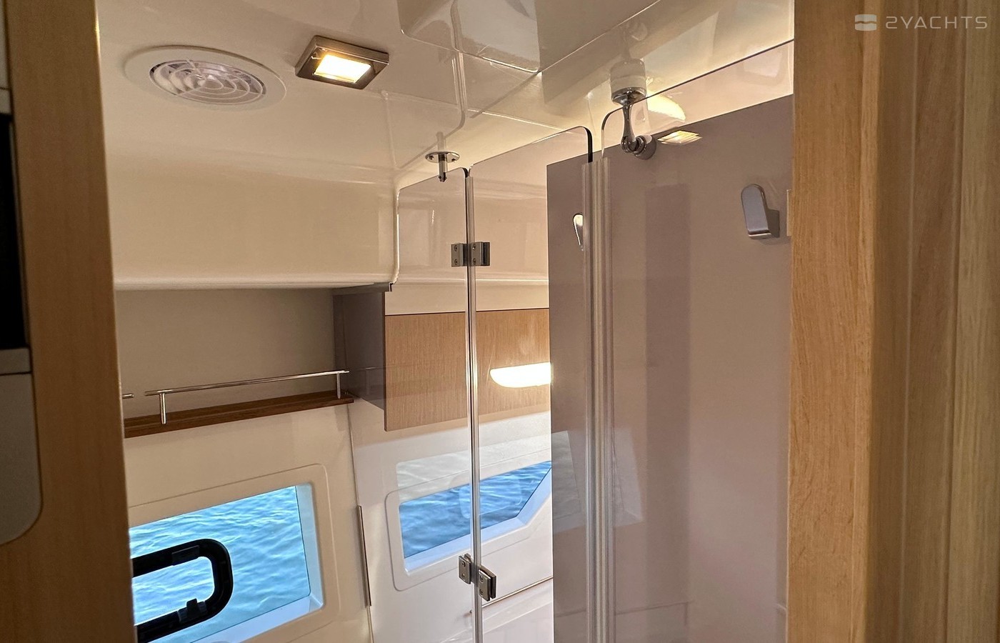 The interior offers an equivalent layout to any classic inboard boat and arguably better in many respects. It has 2 good cabins and a bathroom with separate full size shower. On the main deck a large seating area and Galley with a drinks cooler fridge accessible from the cockpit . Lighting plays an important part in creating the right ambiance to make life easy and enjoyable.