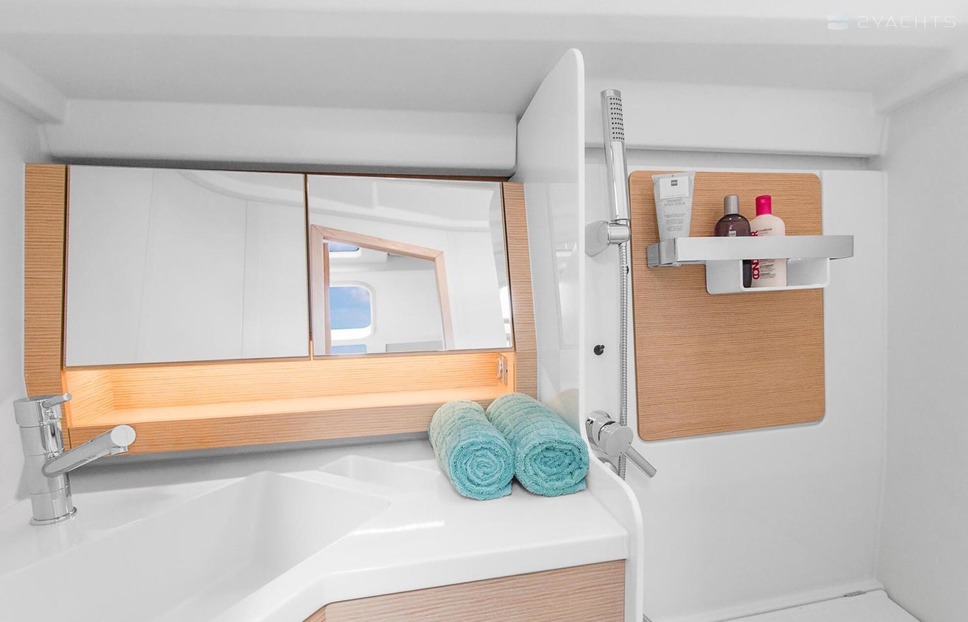B1: Saloon with large L-galley, dining area on stb and sofa on port, separate head with shower stall on port (only with layout C1)