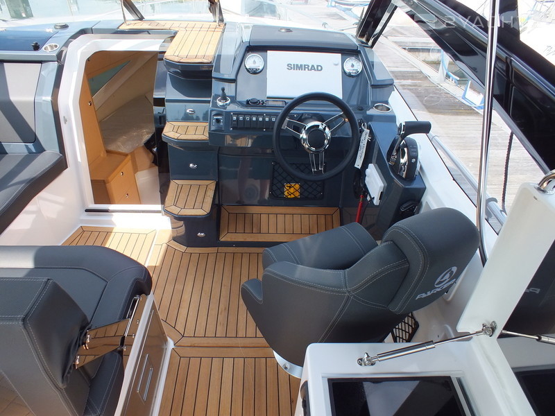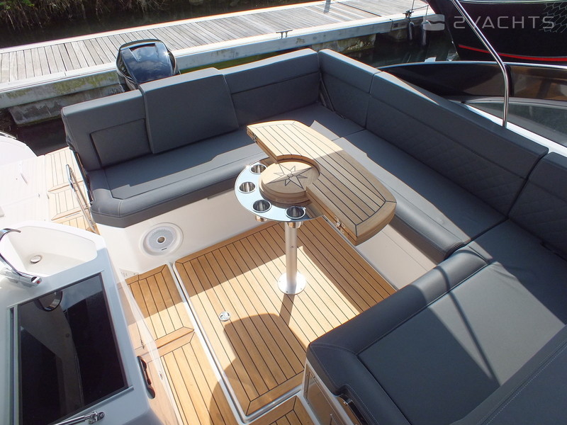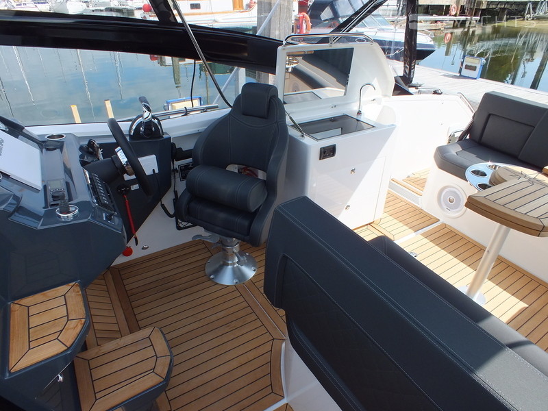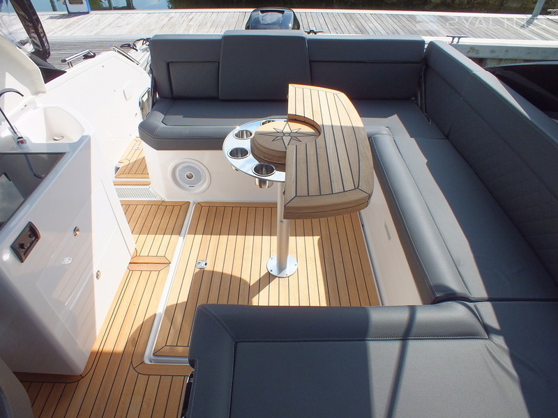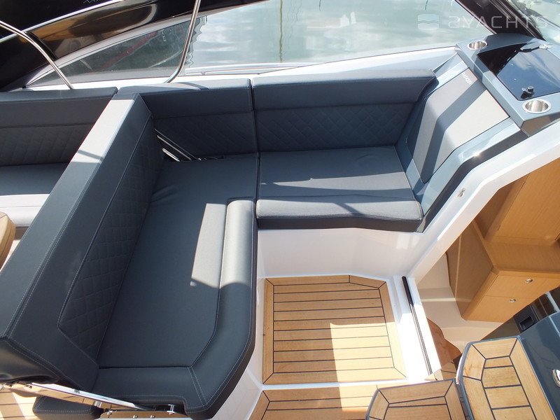 This model is the perfect Daycruiser for up to 10 persons. It is also a great boat for weekend trips, catering comfortably for six persons, or four persons on longer trips. The cockpit is spacious and has flexible seating arrangements. There is a large bathing platform with its own sun-lounger, a sun-lounger in the cockpit, a proper pantry perfect for weekend or longer trips, berths for four to six persons under deck and a separate bathroom with toilet and shower.