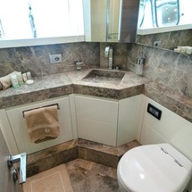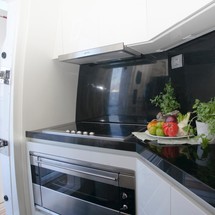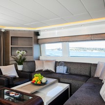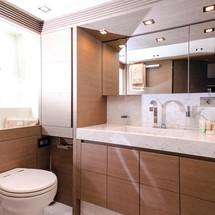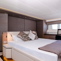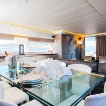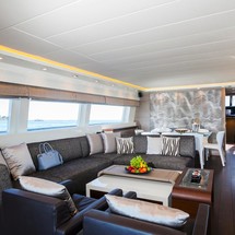 Inside, the modern saloon incorporates both lounge and dining areas and includes a comfortable L-shaped sofa with two separate leather chairs and coffee tables as well as a formal dining table forward. She also features a well-equipped galley with a great range of appliances, including a Smeg oven, stove top and dish washer.
