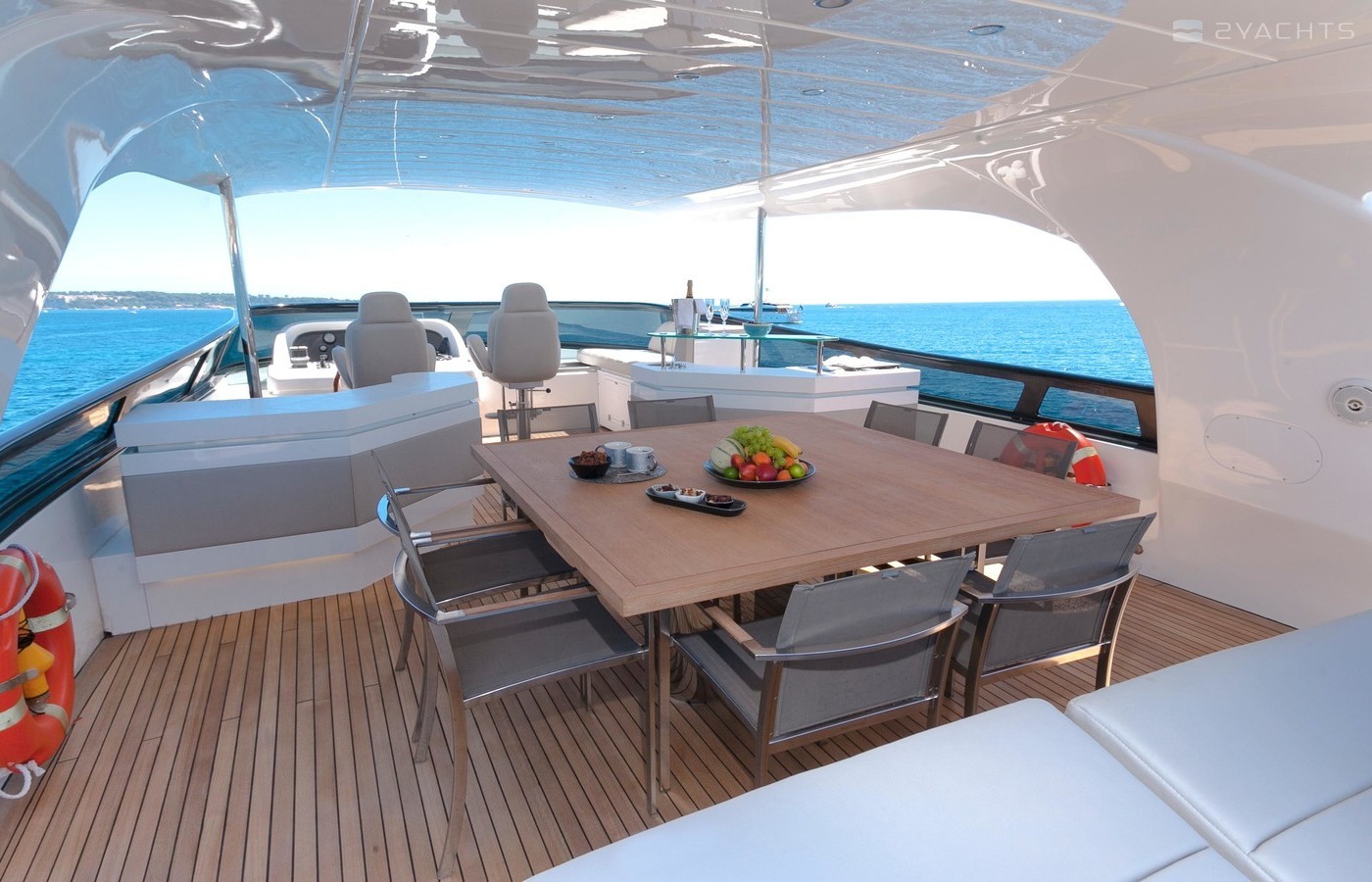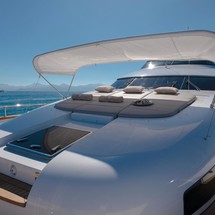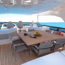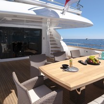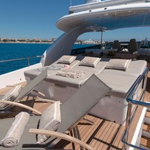 Olga I’s exterior boasts a large foredeck lounging area with retractable bimini top and storage of the PWC below. There is a large dining table on the main deck aft for alfresco entertainment and her ample flybridge boasts a bar, dining table and reclining sun pads.