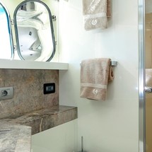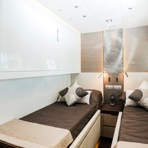 She comfortably accommodates up to 10 guests across four cabins, comprising a comfortable and inviting full beam master suite with walk-around bed, a VIP stateroom with a skylight and two twin cabins with additional pullman’s, one of which can be converted into a double cabin. All cabins are ensuite and equipped with air conditioning and LCD TVs. Additionally, Olga I has 2 crew cabins, allowing her to accommodate up to four crew members.