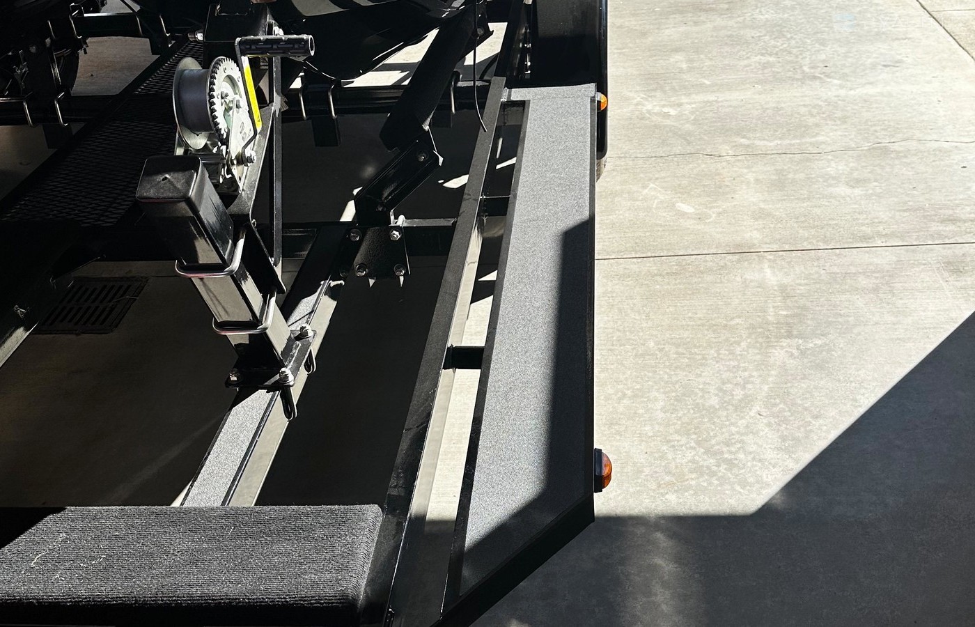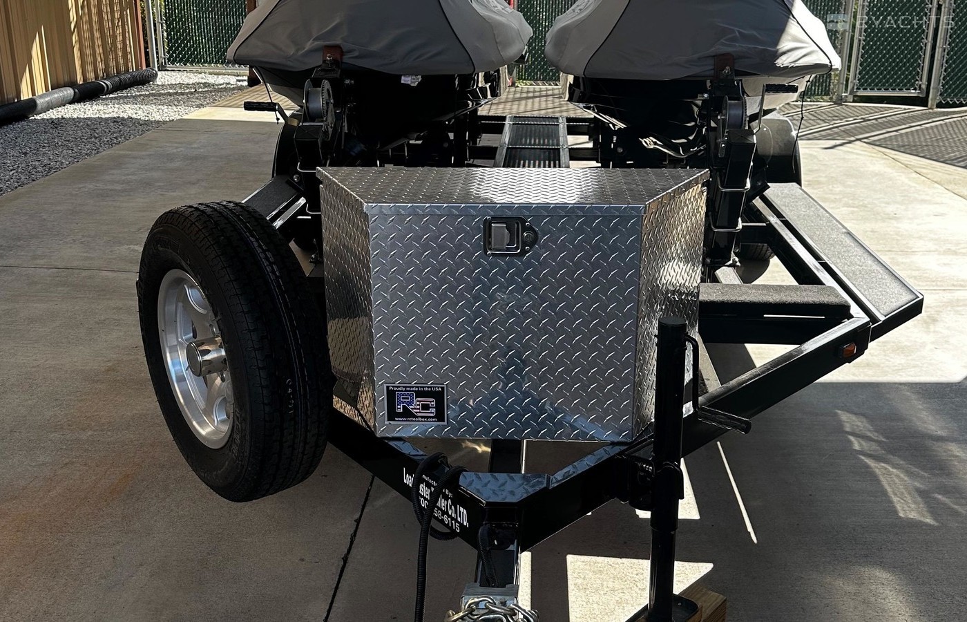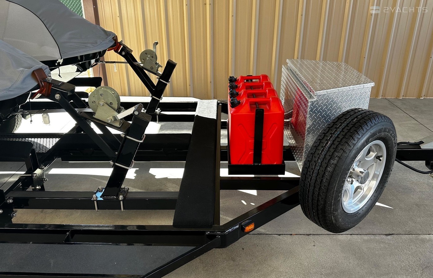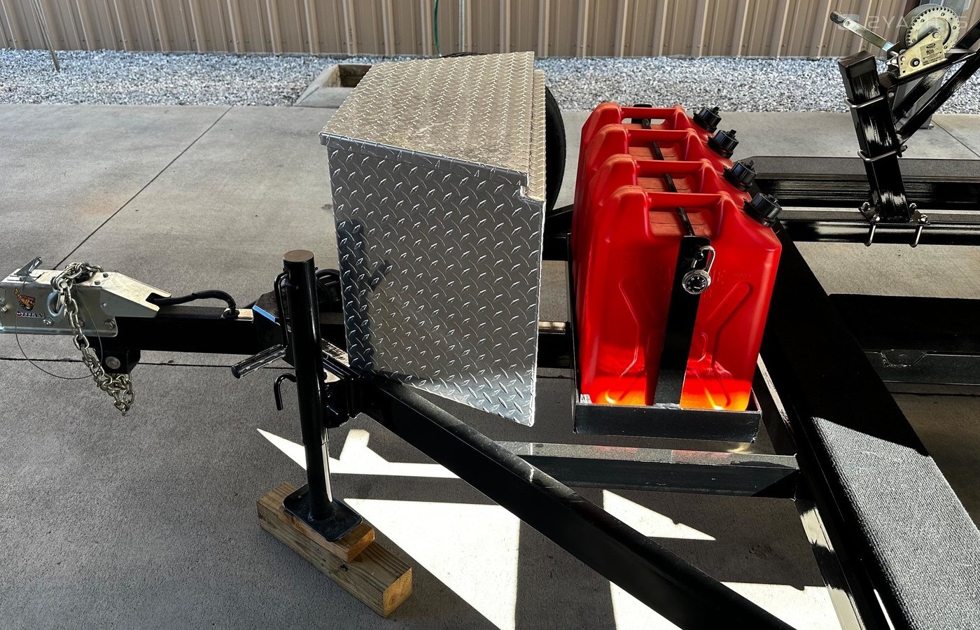 Easy access walk decksSpare tire and wheel mountLocalable gas can rack with 4 -5 gal jeep style gas cansSurge-O-Matic actuated disc brake on all wheelsAluminum locking tool boxAluminum rimsLed Lights4' FrameDouble eye leaf spring suspension
