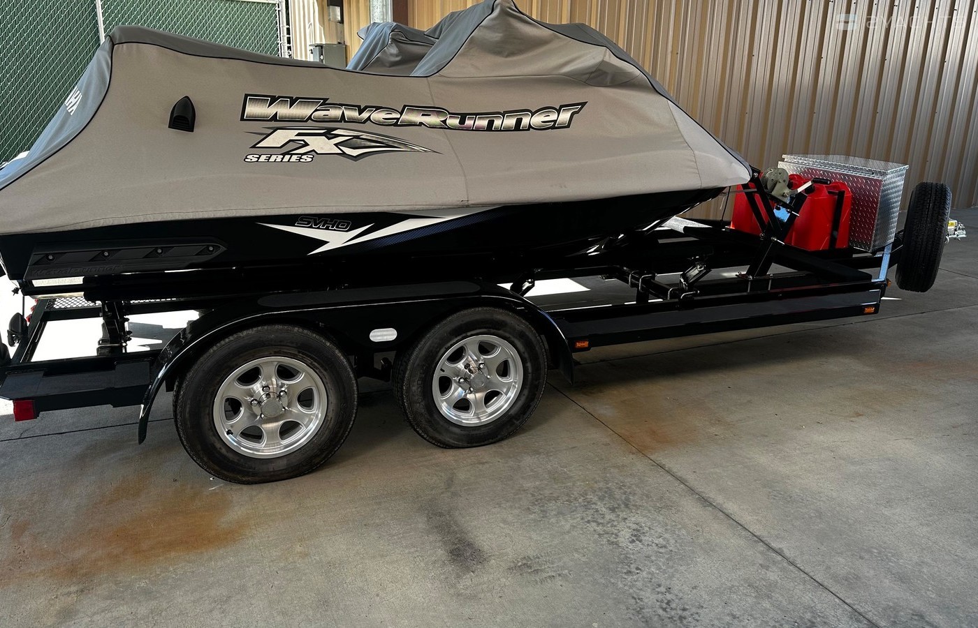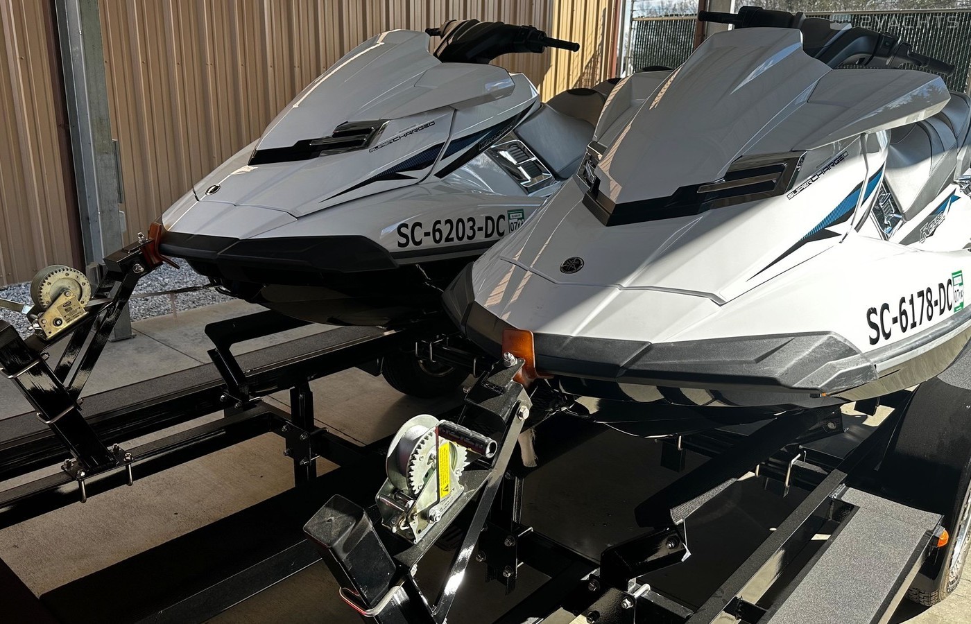 Exceptionally clean low hour (22 and 25 hours) pair of FX Cruiser SVHO Waverunners always stored indoor on tralier and undercover. Custom built trailer for transporting and storing the ski's and equipment securely and confidently.