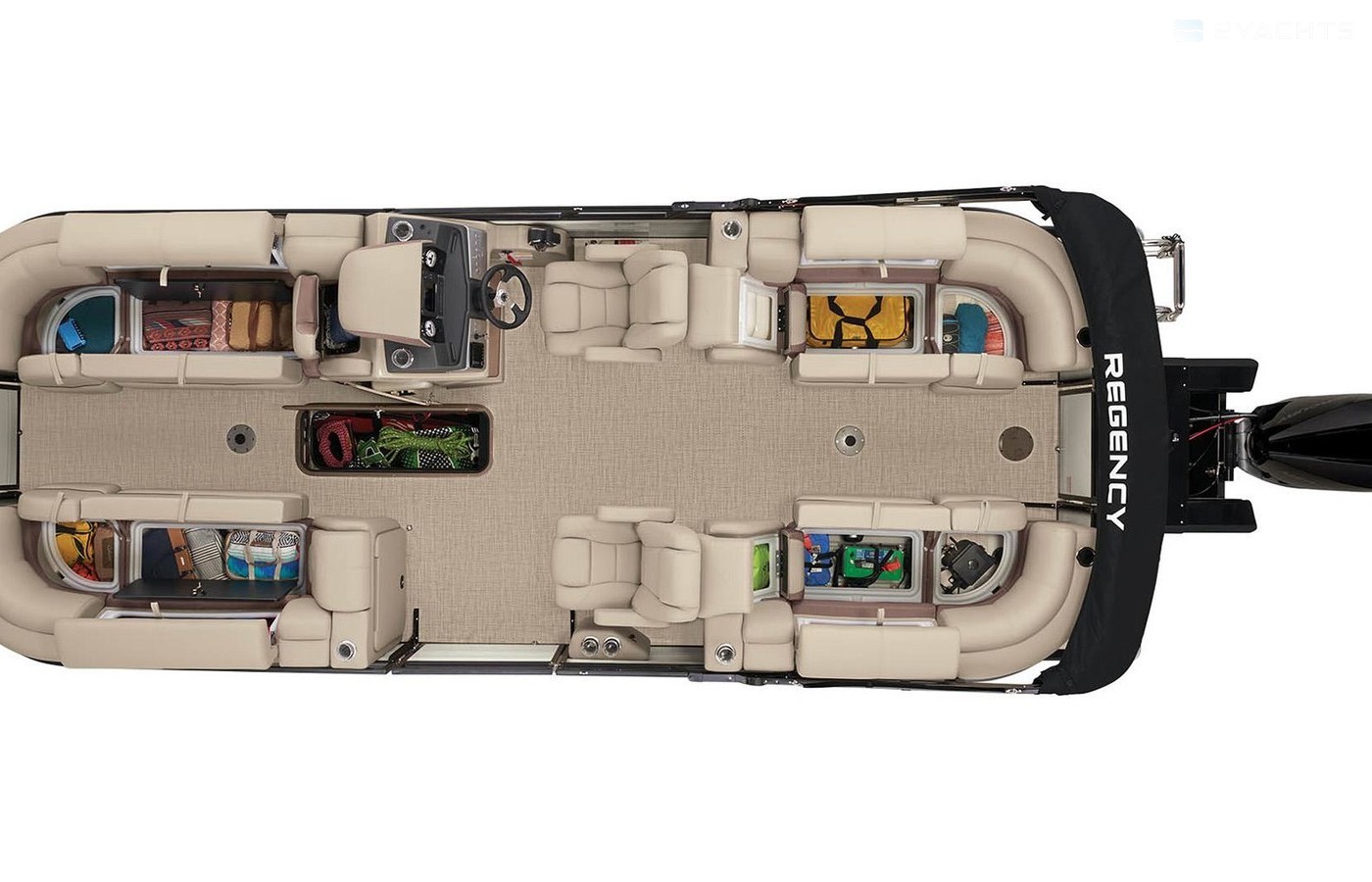 • Aft port & starboard lounges w/STOW MORE™, deep cushions, pillowtop backs, lumbar support, underseat storage & arm storage